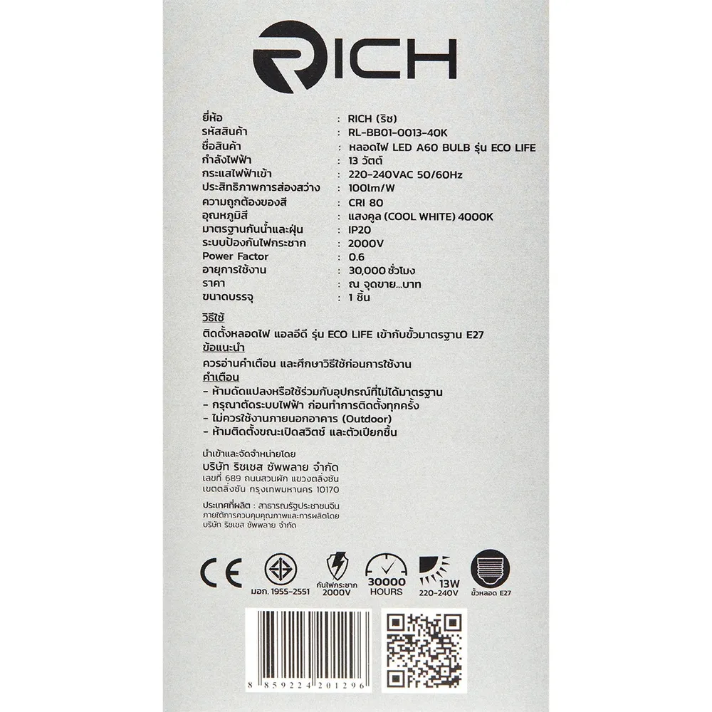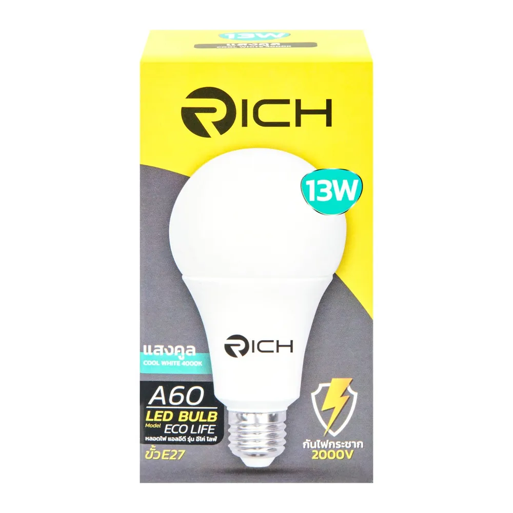 <p>ริช หลอดไฟแอลอีดี รุ่น อีโค่ไลฟ์ 13 วัตต์ แสงคูล ไวท์ 4000K<br />
