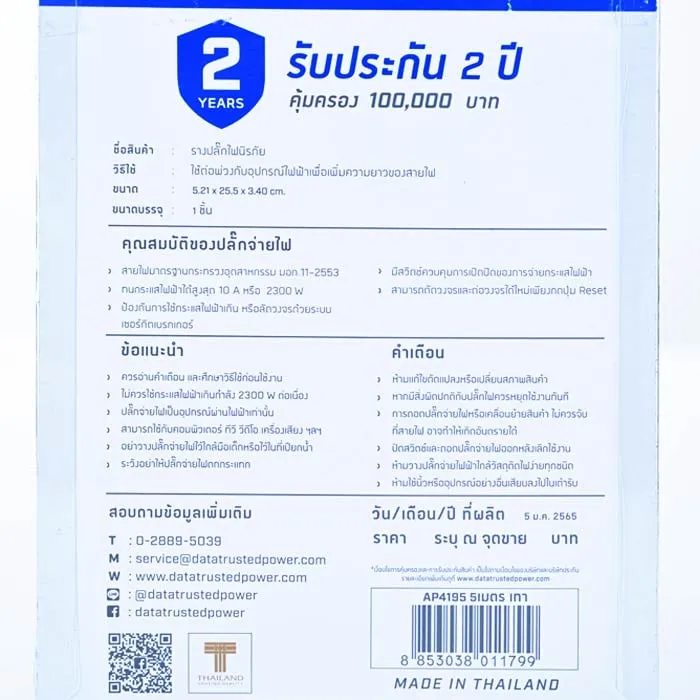 ให้คุณใช้งานเครื่องใช้ไฟฟ้าได้ทั่วทุกมุมบ้านด้วยปลั๊กไฟ 4 ช่อง 1 สวิตช์ สายไฟยาว 5 ม. รุ่น AP4195 ขอบสีเทาจากดาต้า ผลิตจากวัสดุทองแดงอย่างดี ไม่ลามไฟ มาพร้อมเซอร์กิตเบรกเกอร์ตัดไฟอัตโนมัติ มาตรฐาน IEC 60934 และมีม่านนิรภัย พร้อมเต้าเสียบมาตรฐาน เหมาะกับการใช้กำลังไฟไม่เกิน 2300 วัตต์/10 แอมป์/250 โวลต์<br />