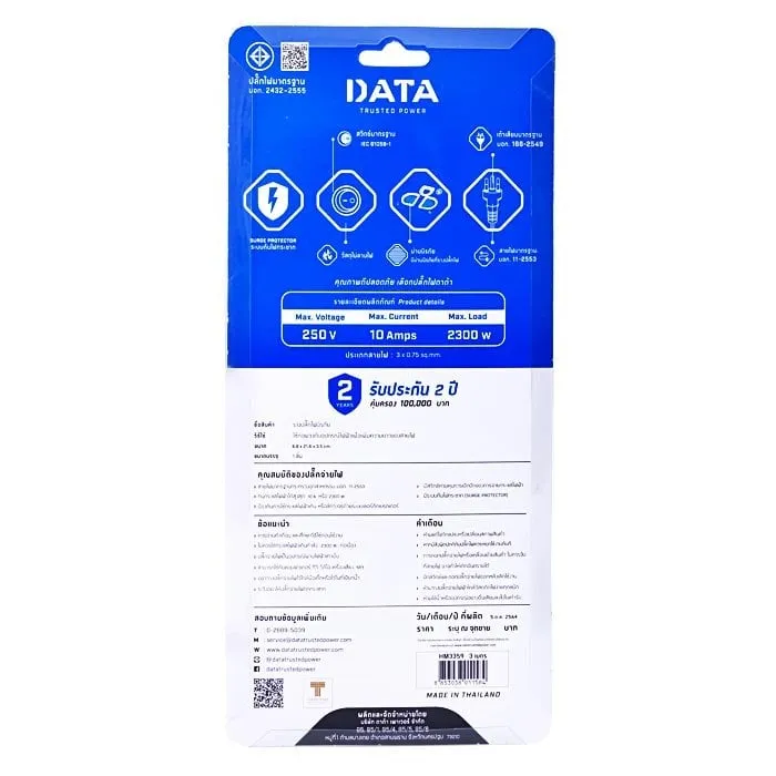 - กำลังไฟฟ้า 10A / 250V เหมาะสำหรับการใช้กำลังไฟไม่เกิน 2300 วัตต์<br />