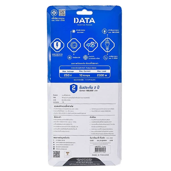 ดาต้า ปลั๊กไฟ 3 ช่อง 3 สวิตช์ สายไฟ 3 เมตร รุ่น HM3359M3W สีขาว