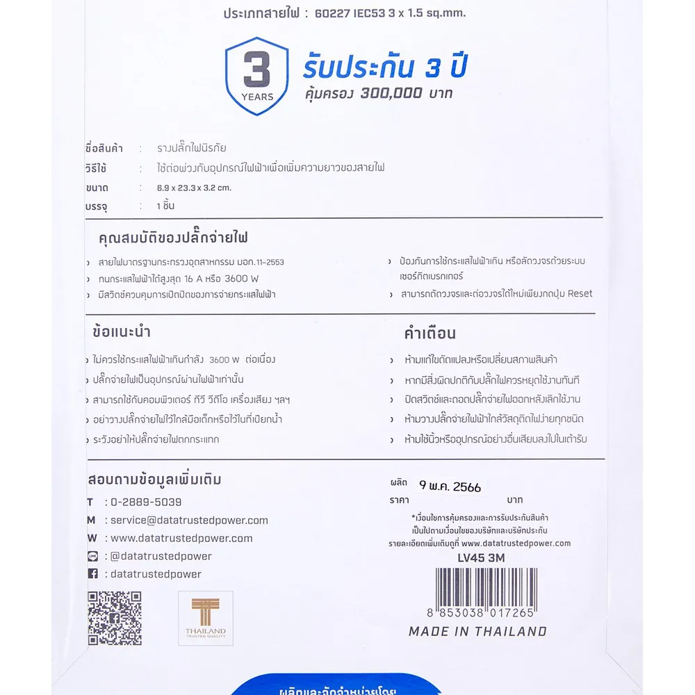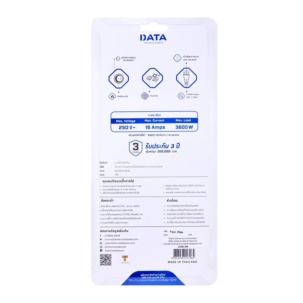 - ทนกระแสไฟฟ้าได้สูงสุด 16A หรือ 3600W<br />