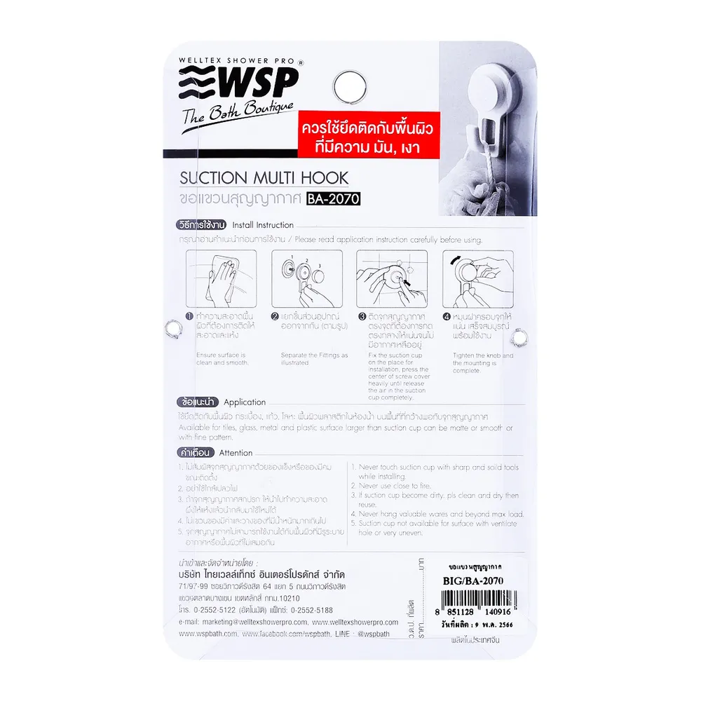 <p>ดับบลิวเอสพี ขอแขวนสุญญากาศ รุ่น BIG/BA-2070<br /><br />ขอแขวนสุญญากาศ WSP รุ่น BIG/BA-2070 ช่วยเพิ่มพื้นที่จัดเก็บในห้องน้ำและห้องอื่น ๆ นิยมใช้แขวนเสื้อผ้าและอุปกรณ์ต่าง ๆ ให้เป็นระเบียบ เหมาะสำหรับบ้านพักอาศัย อพาร์ตเมนต์ หรือพื้นที่จำกัด <br /><br />- ผลิตจากพลาสติก ABS เกรดเอ แข็งแรง ทนทาน<br />- ติดตั้งง่าย ใช้ระบบสุญญากาศ ไม่ต้องเจาะ ไม่ทำลายพื้นผิว<br />- ใช้ได้กับพื้นผิวหลากหลาย เช่น กระเบื้อง แก้ว โลหะ<br />- ช่วยให้คุณใช้พื้นที่ได้อย่างคุ้มค่า<br />- รองรับน้ำหนักได้สูงสุด 1.5 กก.<br />- ไม่ทิ้งคราบกาว<br /><br />*สีของสินค้าอาจมีความแตกต่าง ขึ้นอยู่กับการตั้งค่าของแต่ละหน้าจอ และภาพประกอบใช้เพื่อการโฆษณาเท่า</p>