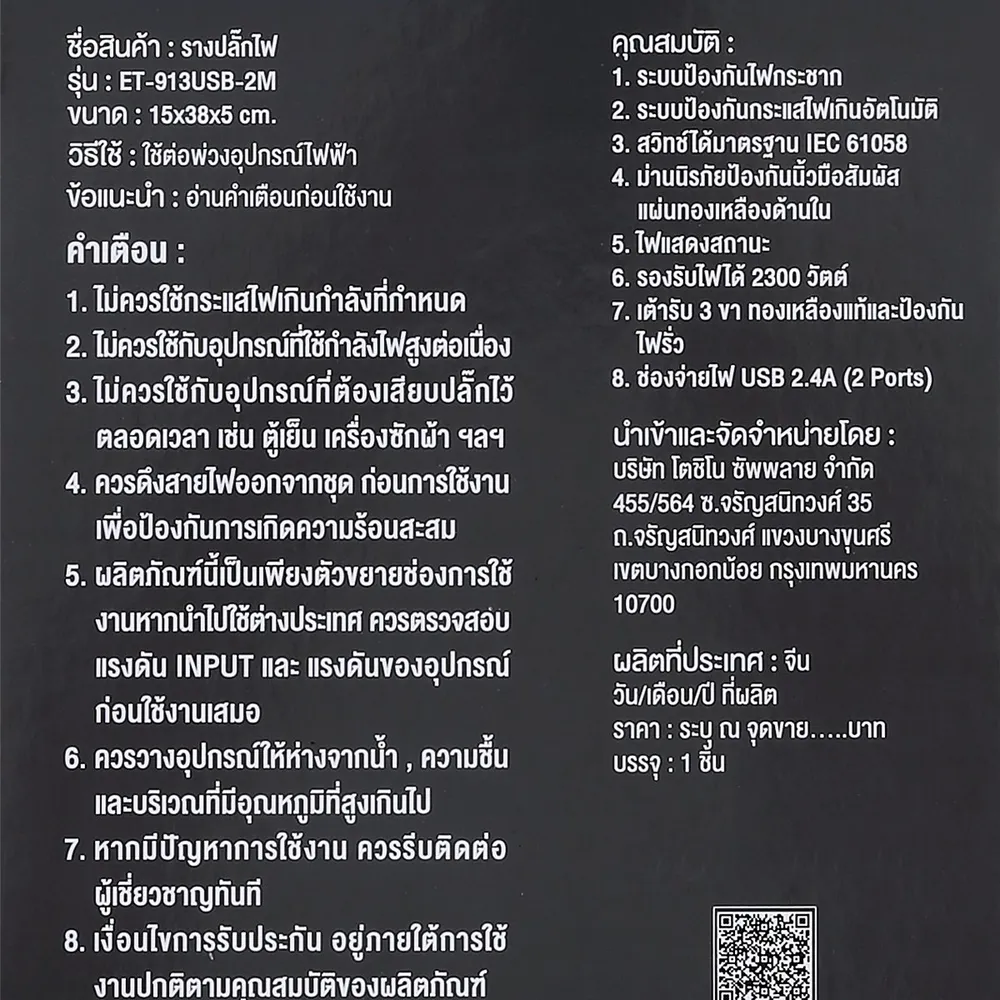 ปลั๊กไฟคุณภาพจาก โทชิโน ให้คุณได้ใช้งานอย่างปลอดภัย ผ่านมาตรฐานสากล มีระบบป้องกันอันตรายจากไฟกระชาก และยังมีม่านนิรภัยป้องกันนิ้วมือผู้ใช้สัมผัสแผ่นทองเหลืองด้านใน<br />