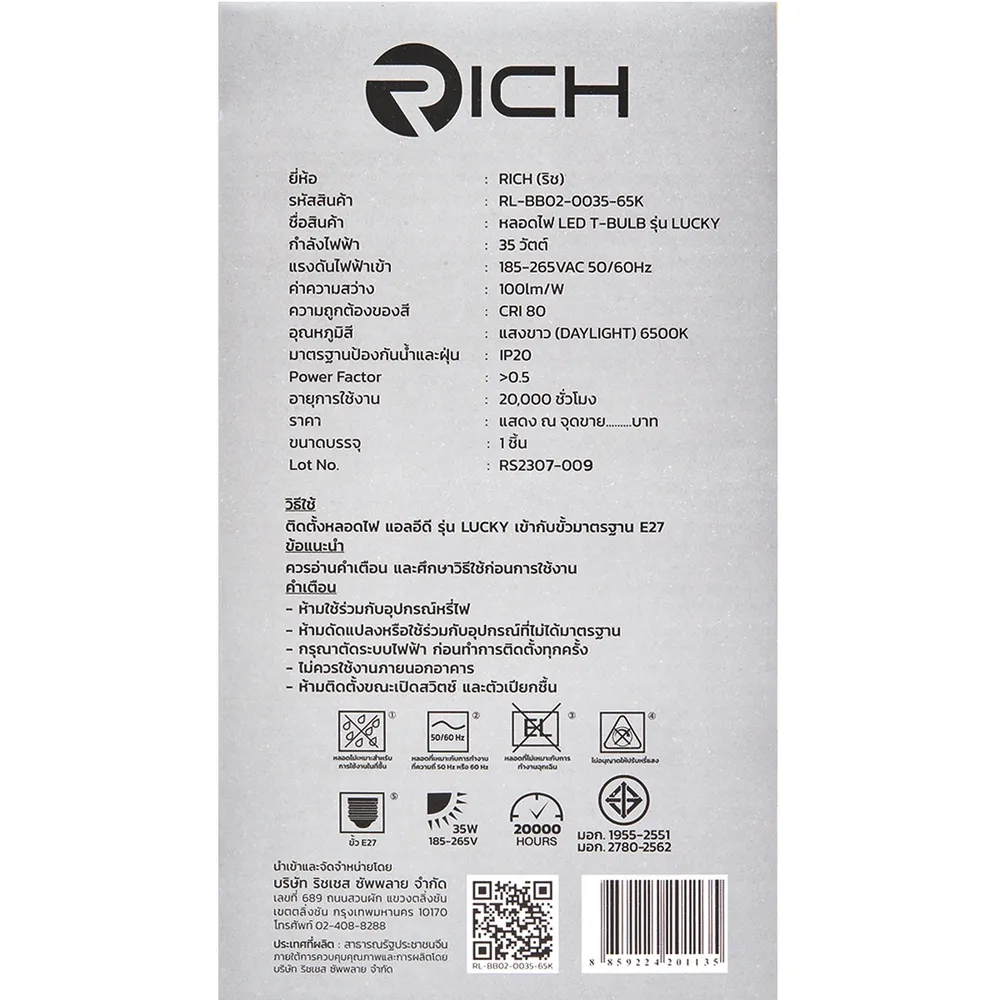 <p>ริช หลอดไฟแอลอีดี T-BULB รุ่น ลัคกี้ 35 วัตต์ แสงขาว เดย์ไลท์ 6500K<br />