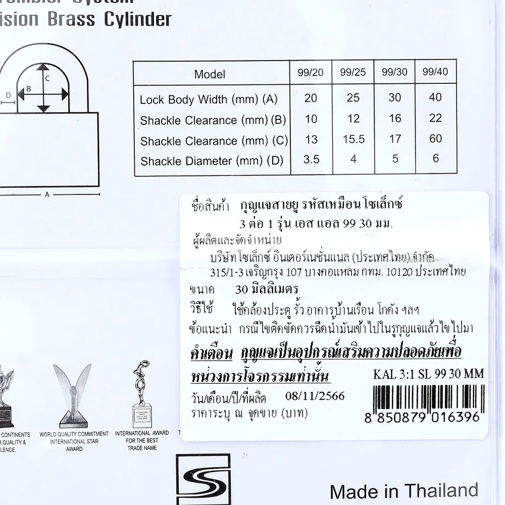 โซเล็กซ์ กุญแจสายยูรหัสเหมือน 3:1 รุ่น SL99 ขนาด 30 มม.
