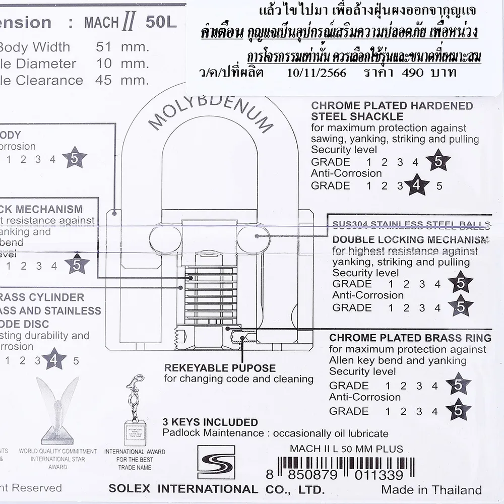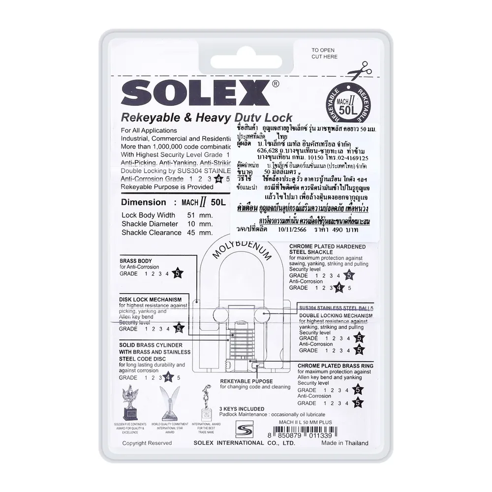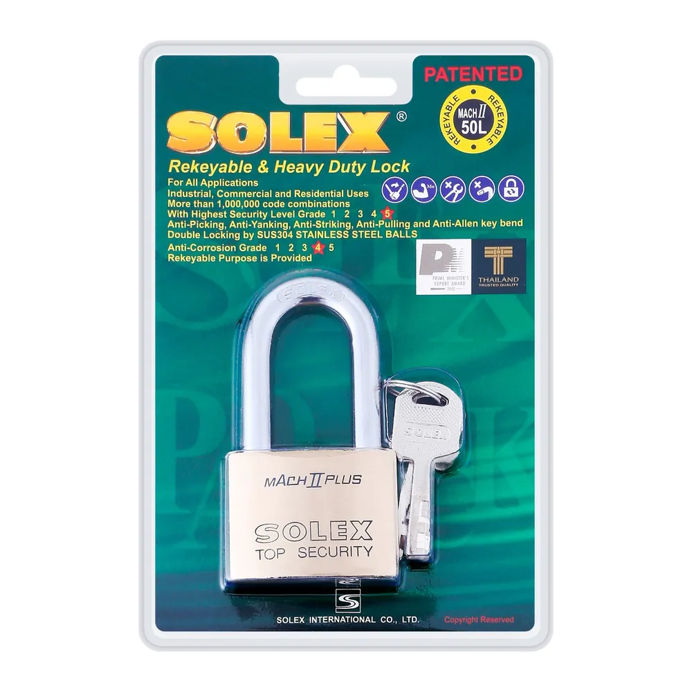 โซเล็กซ์ กุญแจคล้องสายยูคอยาว รุ่น MACH II PLUS L ขนาด 50 มม.