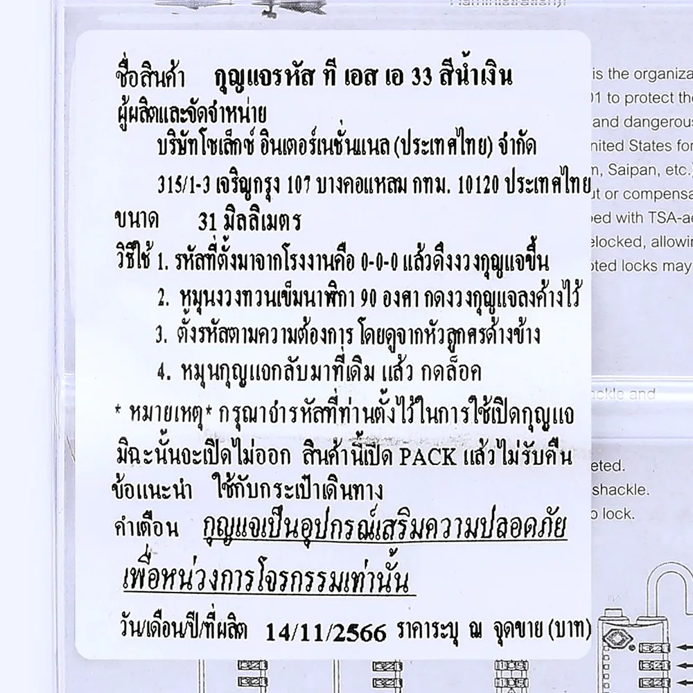 <p>โซเล็กซ์ กุญแจรหัส รุ่น TSA33<br /><br />โซเล็กซ์ ผู้คิดค้นเทคโนโลยีเพื่อป้องกันการโจรกรรมใหม่ ๆ อย่างต่อเนื่อง พร้อมส่งมอบลูกบิดและกุญแจที่มีความแข็งแรงทนทาน ปลอดภัย และมีอายุการใช้งานยาวนาน มาในดีไซน์สวยงามเพื่อให้สามารถเข้ากับบ้านสไตล์ต่าง ๆ ได้<br /><br />- กุญแจคล้อง ล็อคกระเป๋า<br />- ตัวกุญแจผลิตจากวัสดุจาก PVC คุณภาพดี<br />- ขนาดเล็กพกพาสะดวก ตอบโจทย์การล็อคกระเป๋าเดินทาง<br />- TSA ระบบกุญแจมาตรฐานสากล ที่เจ้าหน้าที่ตรวจคนเข้าเมืองเลือกใช้<br />- กุญแจระบบ TSA ถูกใช้อย่างแพร่หลายมากกว่า 600 ประเทศทั่วโลก<br /><br />*สีของสินค้าอาจมีความแตกต่าง ขึ้นอยู่กับการตั้งค่าของแต่ละหน้าจอ และภาพประกอบใช้เพื่อการโฆษณาเท่านั้น</p>