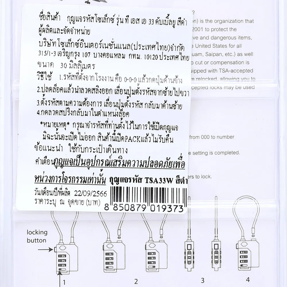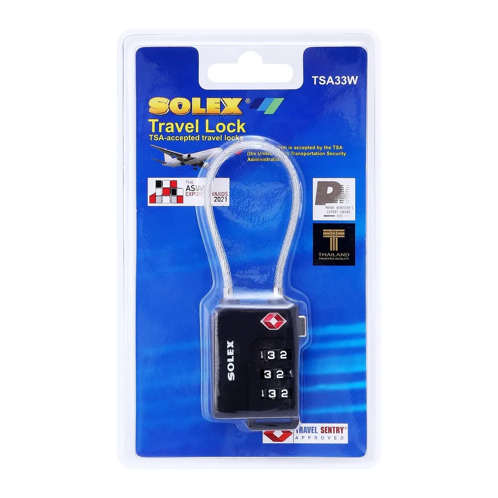 <p>โซเล็กซ์ กุญแจรหัส รุ่น TSA33W<br /><br />โซเล็กซ์ ผู้คิดค้นเทคโนโลยีเพื่อป้องกันการโจรกรรมใหม่ ๆ อย่างต่อเนื่อง พร้อมส่งมอบลูกบิดและกุญแจที่มีความแข็งแรงทนทาน ปลอดภัย และมีอายุการใช้งานยาวนาน มาในดีไซน์สวยงามเพื่อให้สามารถเข้ากับบ้านสไตล์ต่าง ๆ ได้<br /><br />- กุญแจคล้อง ล็อคกระเป๋า<br />- ตัวกุญแจผลิตจากวัสดุจาก PVC คุณภาพดี<br />- งวงกุญแจผลิตจากลวดสลิงถักอย่างดีที่มีความยืดหยุ่น ซึ่งสามารถร้อยผ่านรูเพื่อทำการล็อคได้อย่างสะดวก<br />- TSA ระบบกุญแจมาตรฐานสากล ที่เจ้าหน้าที่ตรวจคนเข้าเมืองเลือกใช้<br />- กุญแจระบบ TSA ถูกใช้อย่างแพร่หลายมากกว่า 600 ประเทศทั่วโลก<br /><br />*สีของสินค้าอาจมีความแตกต่าง ขึ้นอยู่กับการตั้งค่าของแต่ละหน้าจอ และภาพประกอบใช้เพื่อการโฆษณาเท่านั้น</p>