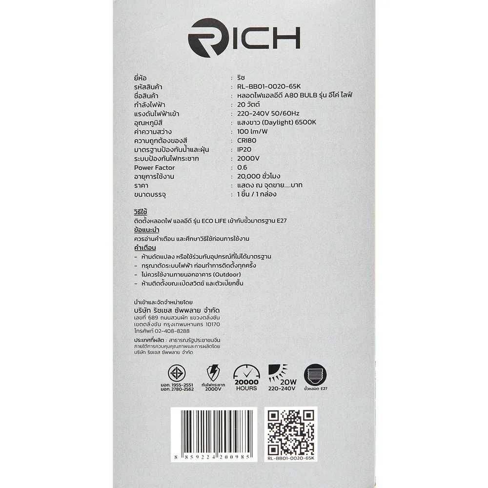 <p>ริช หลอดไฟแอลอีดี รุ่น อีโค่ไลฟ์ 20 วัตต์ แสงขาว เดย์ไลท์ 6500K<br />