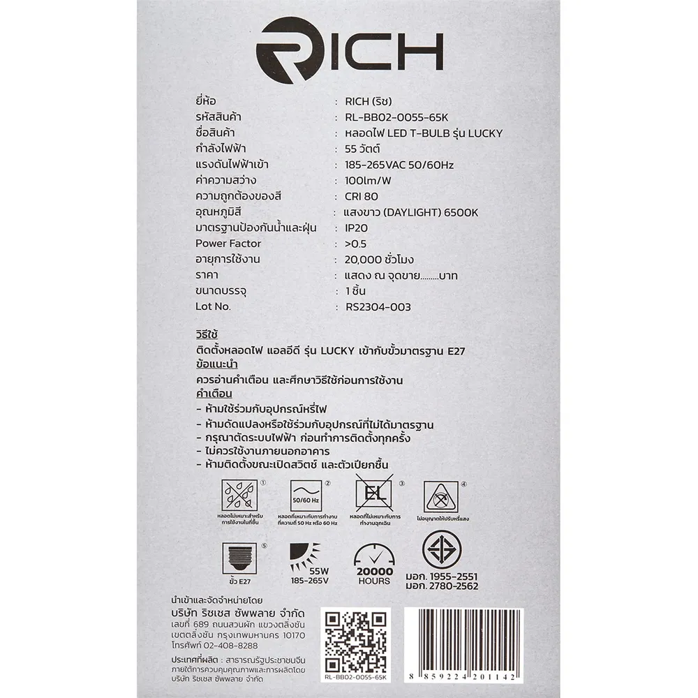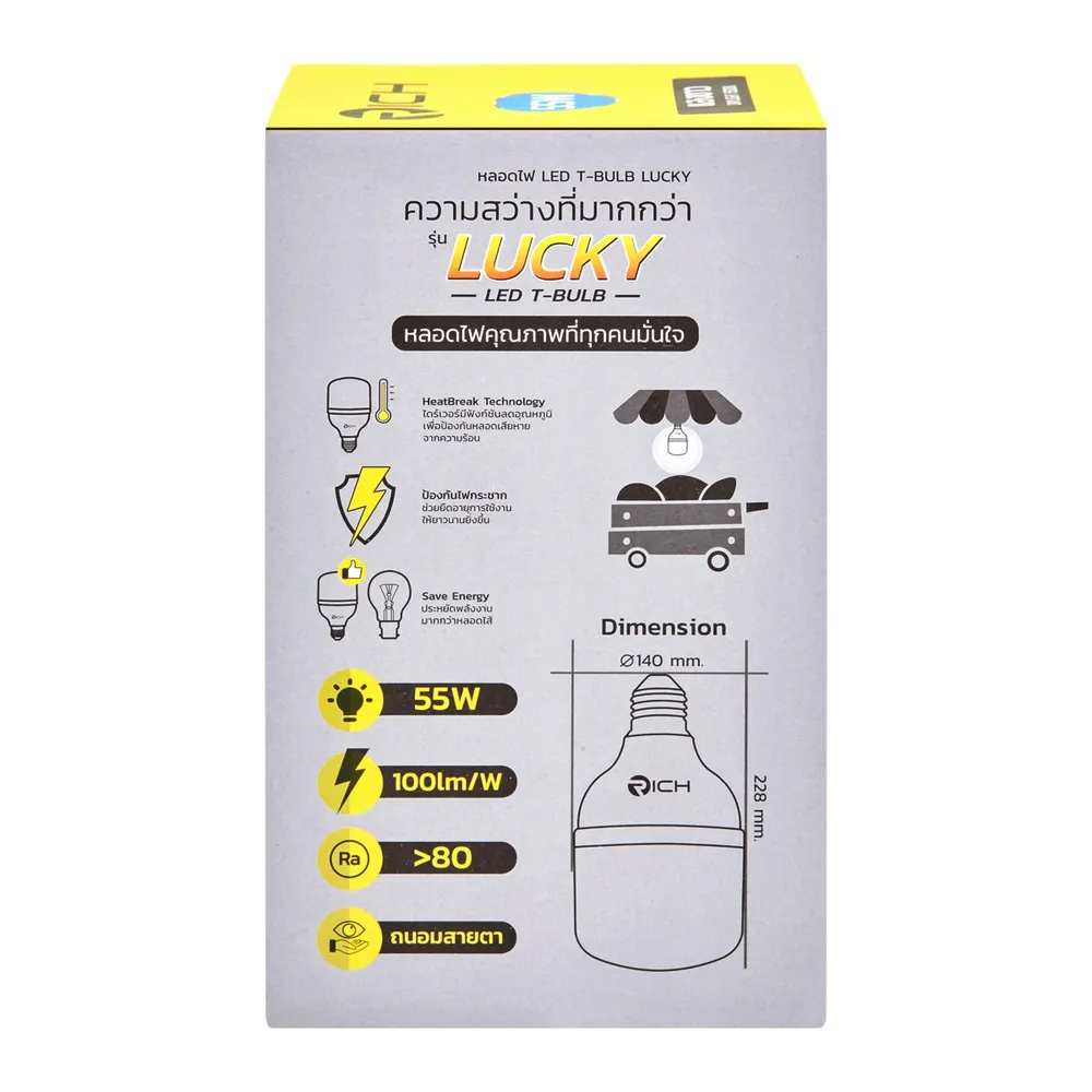 <p>ริช หลอดไฟแอลอีดี T-BULB รุ่น ลัคกี้ 55 วัตต์ แสงขาว เดย์ไลท์ 6500K<br />