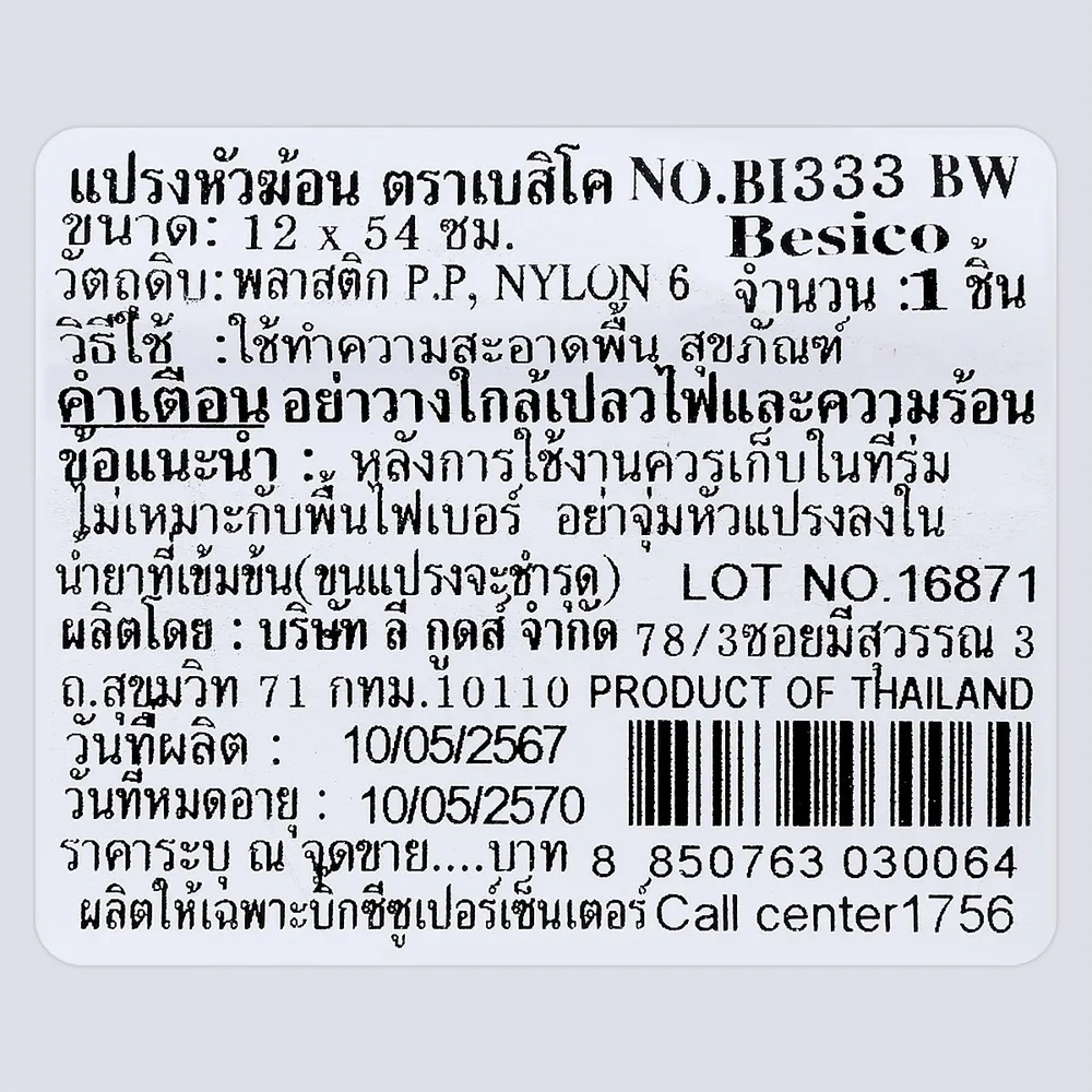<p>เบสิโค แปรงหัวฆ้อน รุ่น BI333 BW<br /> <br /> แปรงขัดพื้นด้ามแข็งแรงทนทาน หัวแปรงออกแบบมาเป็นพิเศษ ที่สามารถรองรับแรงขัดได้อย่างดีเยี่ยม ขนแปรงทำจากพลาสติกที่มีความแข็งแรงทนทานต่อการขัดคราบสิ่งสกปรก คราบตะไคร่น้ำที่ฝังแน่นอยู่บนพื้นปูนซีเมนต์ กระเบื้อง หรือพื้นห้องน้ำต่าง ๆ<br /> <br /> - ขจัดคราบออกได้โดยง่าย<br /> - แข็งแรงทนทานต่อการใช้งาน<br /> - ทำความสะอาดได้หมดจดทุกซอกมุม<br /> - ลดเวลาในการทำความสะอาดได้ดีเยี่ยม<br /> <br /> <span style="color: #ff0000;">*บริษัทฯ ขอสงวนสิทธิ์ในการปรับเปลี่ยนราคาจำหน่ายและโปรโมชั่น รวมถึงแพ็คเกจและปริมาณสินค้าจากผู้ผลิตได้ตามความเหมาะสม โดยไม่จำเป็นต้องแจ้งให้ทราบล่วงหน้า</span><br /> <br /> *สีของสินค้าอาจมีความแตกต่าง ขึ้นอยู่กับการตั้งค่าของแต่ละหน้าจอ และภาพประกอบใช้เพื่อการโฆษณาเท่านั้น</p>