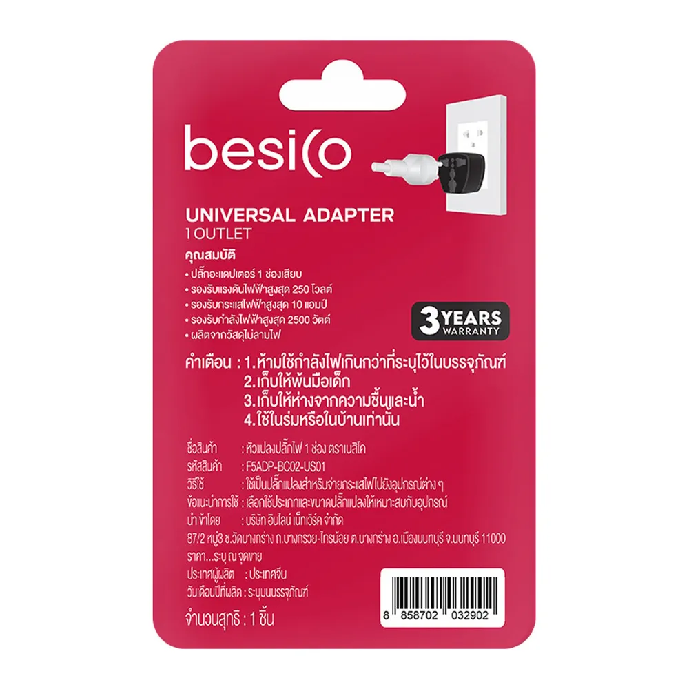 <p>เบสิโค อะแด็ปเตอร์ 1 ช่อง รุ่น F5ADP-BC02-US01 สีดำ<br />