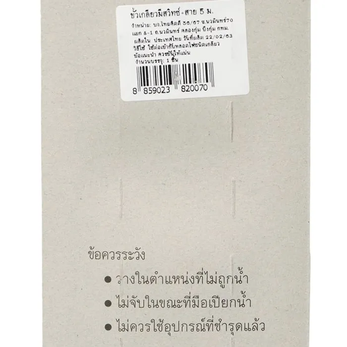 เพิ่มแสงสว่างภายในบ้านได้เรียบร้อยด้วยขั้วเกลียวมีสวิทซ์ พร้อมสาย 5 ม. ผลิตจากวัสดุคุณภาพ ใช้สำหรับต่อเข้ากับหลอดไฟชนิดเกลียว สามารถเลือกติดตั้งได้ตามต้องการ<br />