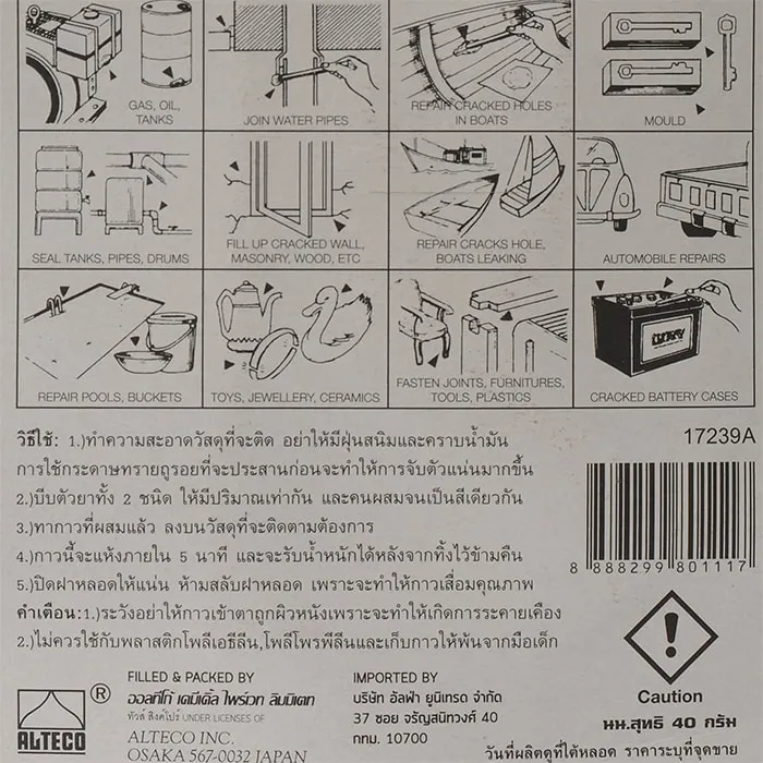<p>ออลทีโก้ กาวอีพ็อกซี่ 2 ตันสีใส 40 ก.<br /><br />เออลทีโก้ กาวอีพ็อกซี่ 2 ตันสีใส ตัวช่วยในการทำงานช่างที่เหมาะสำหรับงานซ่อมเร่งด่วน งานซ่อมที่ต้องใช้ความละเอียดอ่อน ต้องการความสวยงามของผิวงาน ใช้ได้ดีกับงานซ่อมเครื่องประดับ ติดงานจิวเวลรี่ เนื้อกาวใสเหมือนผลึกแก้ว ไม่ขุ่นเหลืองแม้แข็งตัวก็ยังคงความใส <br /><br />- ทนต่อความร้อน สารเคมี น้ำมัน และกันน้ำได้ดี<br />- ใช้งานง่ายทั้งยังแห้งเร็วภายใน 5 นาที ประหยัดเวลา<br />- เนื้อกาวใสเหมือนผลึกแก้ว ไม่ขุ่นเหลือง แม้แข็งตัวก็ยังคงความใส<br />- เหมาะสำหรับงานซ่อมเร่งด่วน งานซ่อมละเอียดอ่อน ที่คงไว้ซึ่งความสวยงาม<br />- ยึดติดได้กับพื้นผิวหลากหลายชนิด เช่น แก้ว กระจก เซรามิค หินอ่อน ฯลฯ<br /><br /><span style="color: #ff0000;">สินค้าที่ได้รับอาจมีการปรับเปลี่ยนแพ็คเกจและปริมาณจากผู้ผลิต ขออนุญาตสงวนสิทธิ์ในการเปลี่ยนแปลงดังกล่าว โดยไม่แจ้งให้ทราบล่วงหน้า</span><br /><br />*ภาพประกอบใช้เพื่อการโฆษณาเท่านั้น</p>