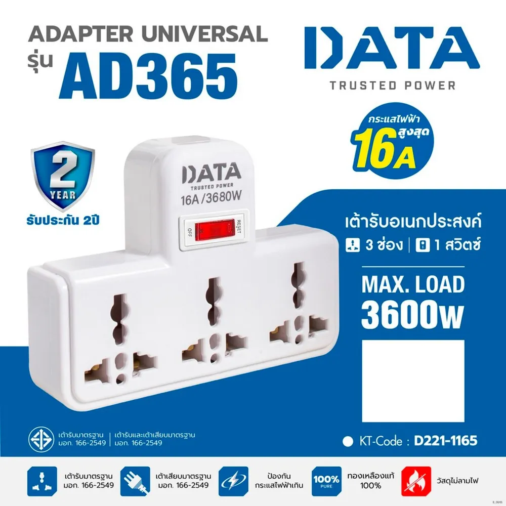 <p>ดาต้า อะแดปเตอร์ เต้ารับ 3 ช่อง 1 สวิตซ์ 16 แอมป์ 3600 วัตต์ รุ่น AD365<br />