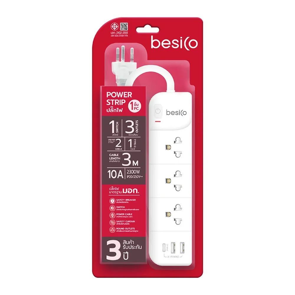 เบสิโค ปลั๊กไฟ 1 สวิตช์ 3 ช่องเสียบ USB-A 2 ช่อง Type-C 1 ช่อง สายไฟยาว 3 ม.