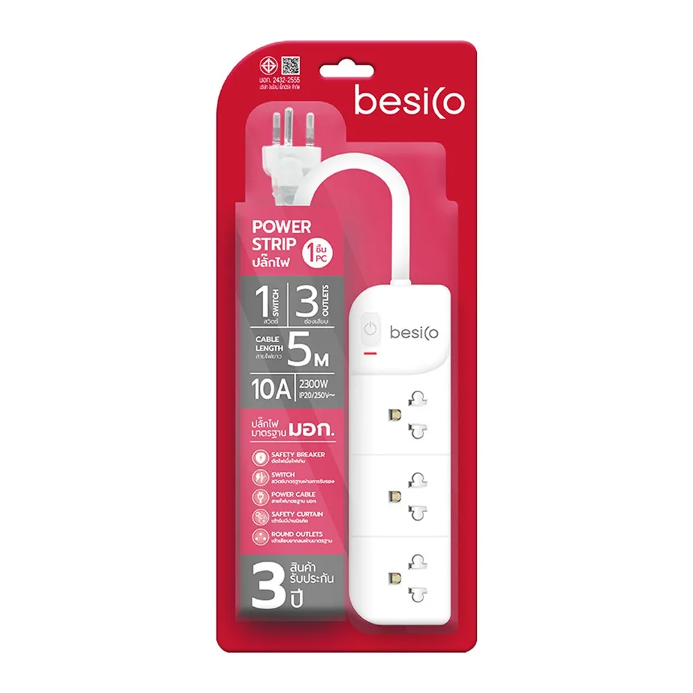 <p>เบสิโค ปลั๊กไฟ 1 สวิตช์ 3 ช่องเสียบ สายไฟยาว 5 ม.<br />