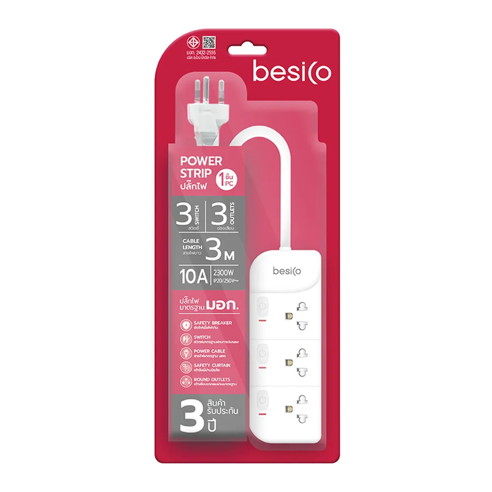 เบสิโค ปลั๊กไฟ 3 สวิตช์ 3 ช่องเสียบ สายไฟยาว 3 ม.