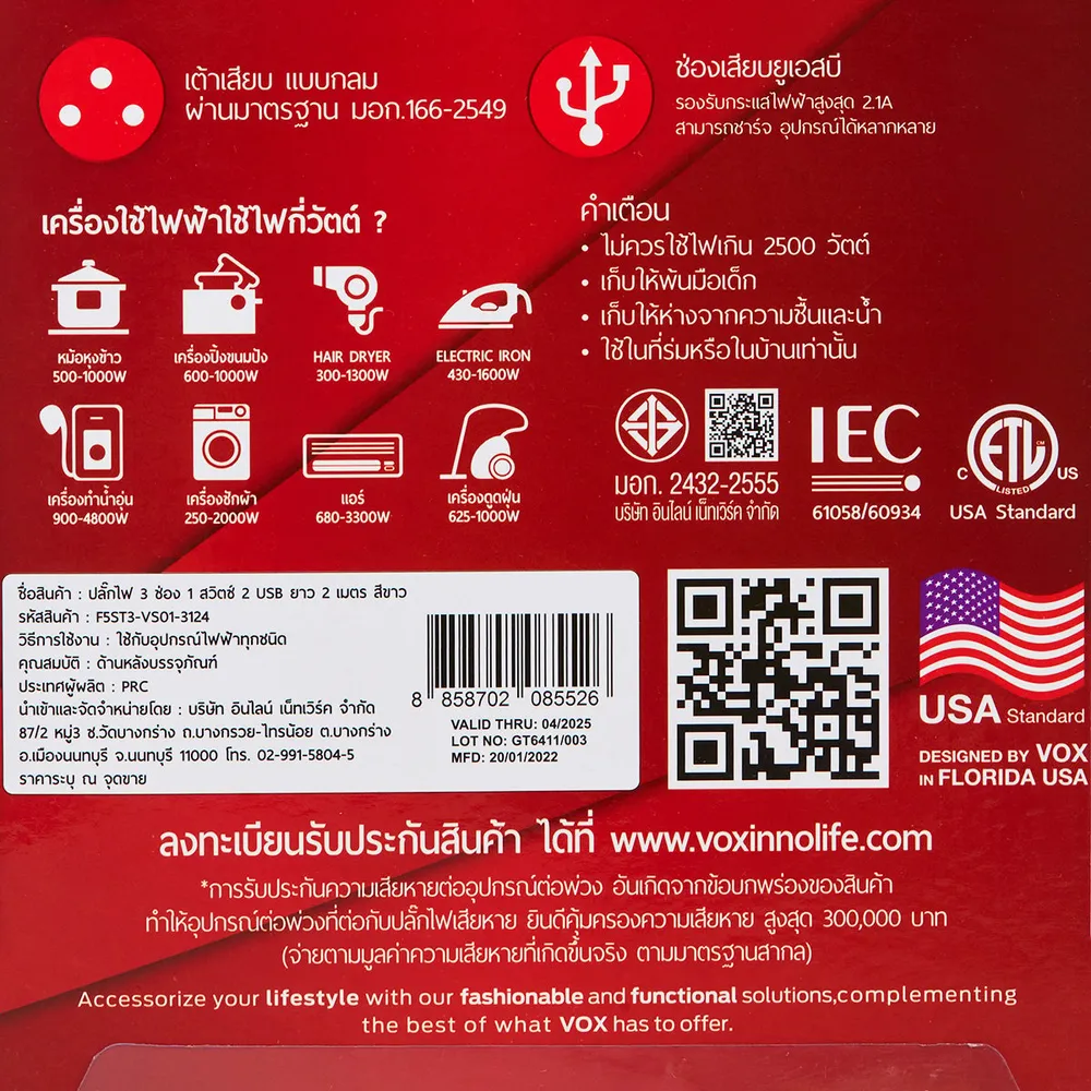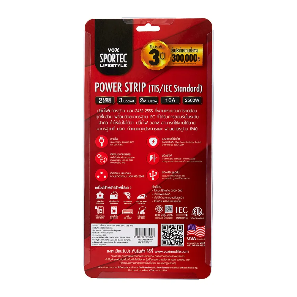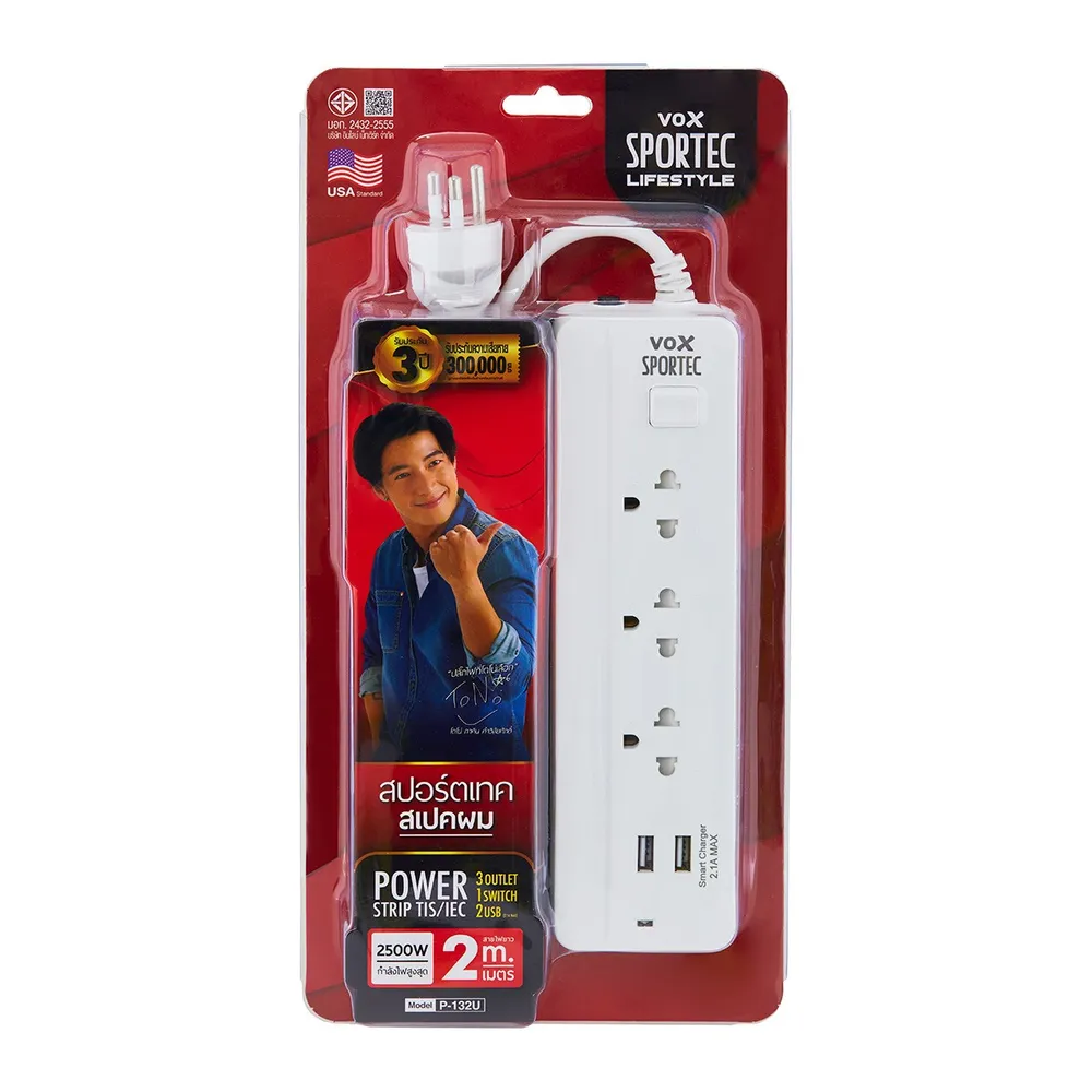 ให้คุณหยิบใช้งานเครื่องใช้ไฟฟ้าได้อย่างทั่วถึงทุกมุมบ้านด้วยปลั๊กไฟ 3 ช่อง 1 สวิตช์ 2 USB มาพร้อมความยาวสายไฟ 2 ม. ผลิตจากวัสดุคุณภาพ สายไฟได้มาตรฐาน มอก. มีเต้ารับม่านนิรภัย ป้องกันนิ้วมือ เบรกเกอร์นิรภัย ตัดไฟเมื่อใช้เกิน รับประกันคุณภาพจากผู้ผลิตนานถึง 3 ปี<br />