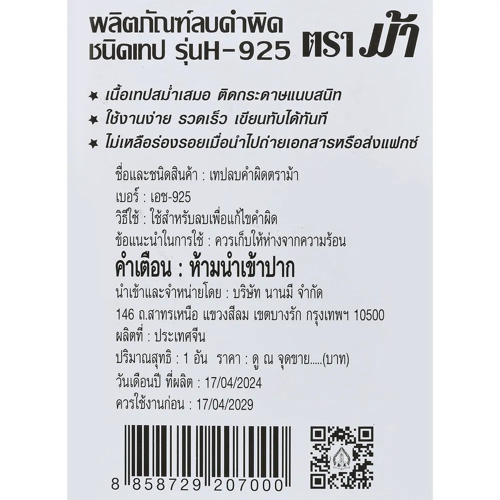 ตราม้า เทปลบคำผิด รุ่น H-925 ขนาด 5 มล. x 8 ม.