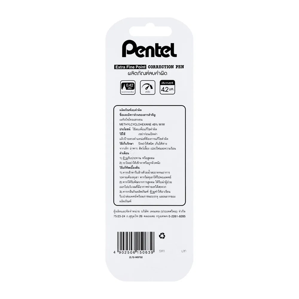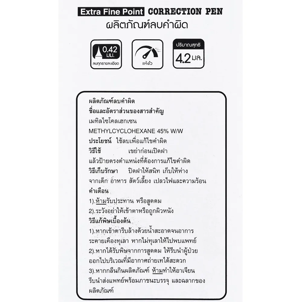 ปากกาลบคำผิด เพนเทล ขนาด 4.2 มล. ปากกาลบคำผิดดีไซน์แบบหัวเข็ม (Fine point) ช่วยให้บีบง่าย ไหลลื่น แห้งไว ไม่อุดตัน เพิ่มประสิทธิภาพในการลบ น้ำไม่มีกลิ่นเหม็น ลบหมึกปากกาทุกชนิดหมดทุกจุด เมื่อนำไปถ่ายเอกสารไม่เป็นจุดด่างดำ น้ำยาสูตรเฉพาะป้องกันการระเหย ไม่ทำลายชั้นบรรยากาศ เป็นมิตรต่อสิ่งแวดล้อม ผ่านการรับรองมาตรฐานฉลากเขียว<br />