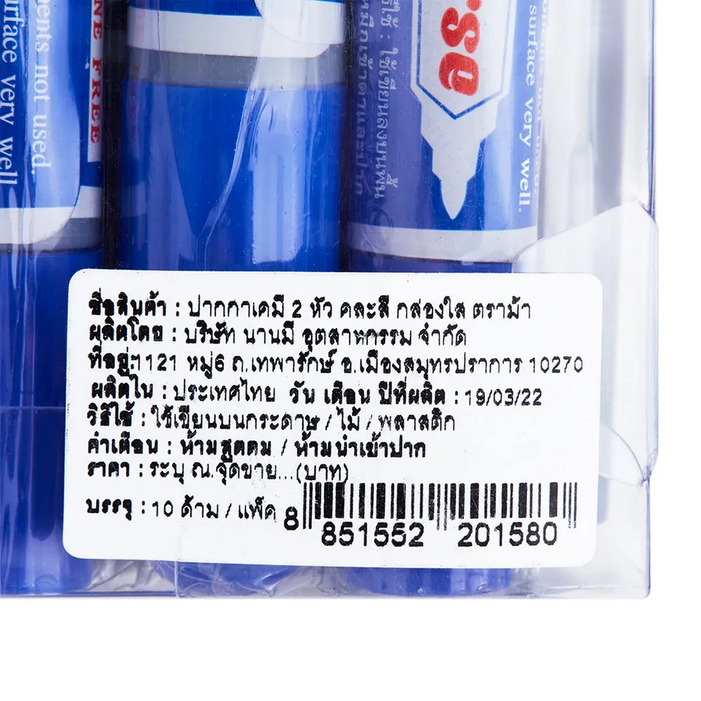 ปากกาเคมี 2 หัว คละสี ผลิตภัณฑ์คุณภาพตราม้า ให้สีที่คมเข้ม เขียนติดทน ติดแน่น เขียนได้บนวัสดุที่หลากหลาย เช่น กระดาษ พลาสติก โลหะ ไม้ และอื่นๆ หมึกแห้งไว ไม่ไหลเลอะเทอะ เปรอะเปื้อนมือ ปลอดภัยกับคนใช้ ไม่มีสารที่เป็นอันตรายต่อสุขภาพ<br />