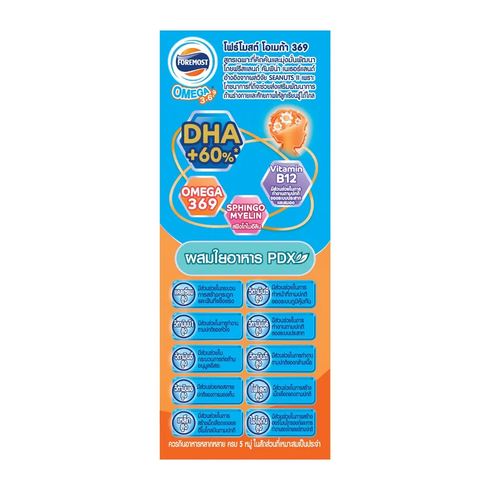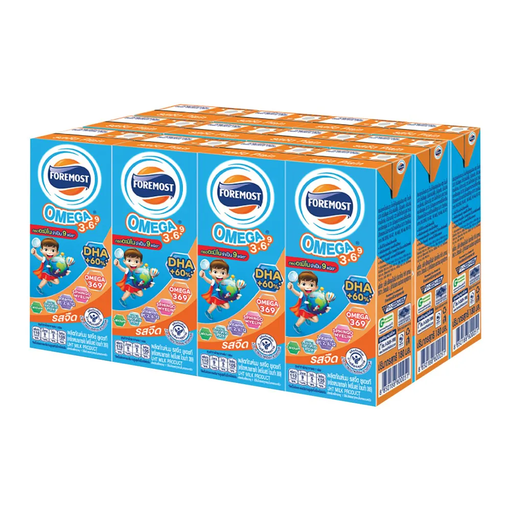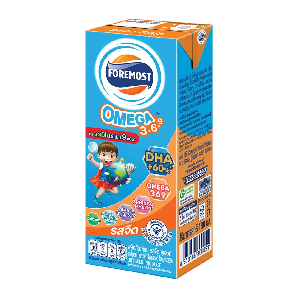 เอร็ดอร่อยได้คุณค่าไปกับ นม UHT โฟร์โมสต์ โอเมก้า 369 ที่มีกรดอะมิโนจำเป็น 9 ชนิด มีดีเอชเอ วิตามินบี 1 วิตามินบี 12 โฟเลต และแคลเซียมสูง ช่วยเสริมสร้างพัฒนาการของลูกน้อย<br />