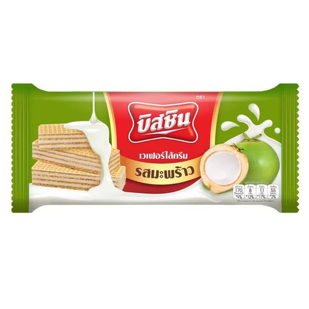 กรุบกรอบไปกับ บิสชิน เวเฟอร์ ไส้ครีมรสมะพร้าวแสนอร่อย ที่ให้รสชาติเข้มข้น พร้อมความหอมหวานที่จะทำให้คุณรื่นรมย์ไปพร้อมกับเครื่องดื่มที่คุณโปรดปราน<br />