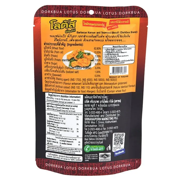 ขนมรูปน่องไก่ทรงเครื่องตราดอกบัว เคี้ยวกรุบๆ กรอบๆ กินเล่นกันเพลินๆ ไปกับขนมขาไก่ หอม กรอบ อร่อย ขนมธรรมดาๆ แต่อร่อยแบบไม่ธรรมดา มีความเป็นเอกลักษณ์ ไม่ว่าจะอยู่ในวัยไหน อยู่ในเวลาใด หรือกำลังทำอะไรก็สามารถทานได้ตลอด ยิ่งเคี้ยว ยิ่งมัน ยิ่งเพลินใจ ตราดอกบัวเป็นโลโก้ที่แสดงบนกว่า 30 บิสกิตและขนมปังผลิตภัณฑ์จากถังคิมเฮง คุณภาพที่เข้มงวดและราคาที่เป็นมิตรความแข็งแรงของผลิตภัณฑ์ที่ได้รับรางวัลในหัวใจของผู้บริโภคในช่วงหลายปี<br />