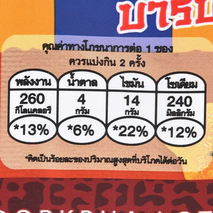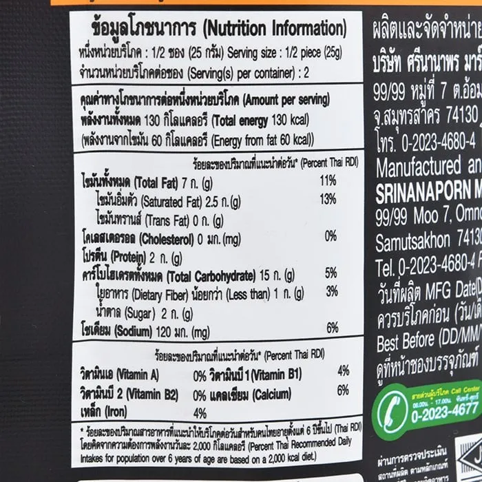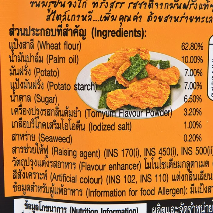 - แป้งสาลี 71.84% น้ำตาล 16% น้ำมันปาล์ม 10% เกลือ 2% พริกไทย 0.16%<br />