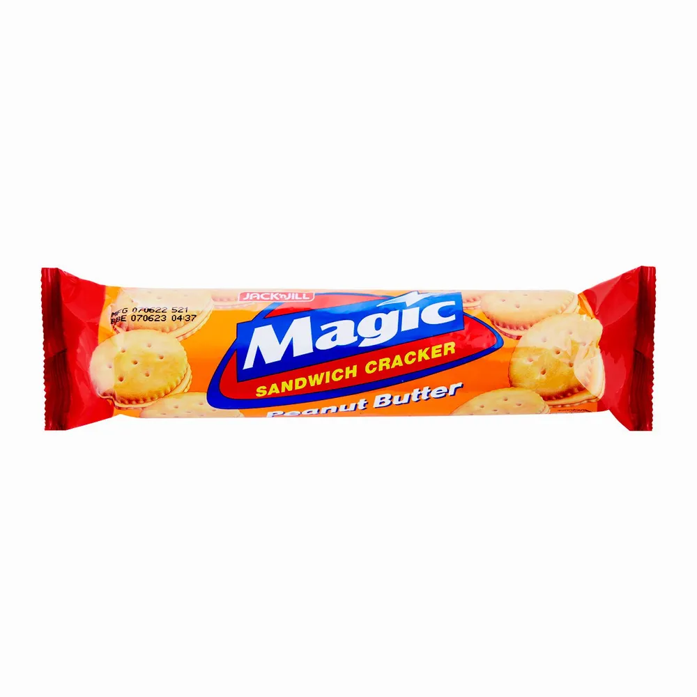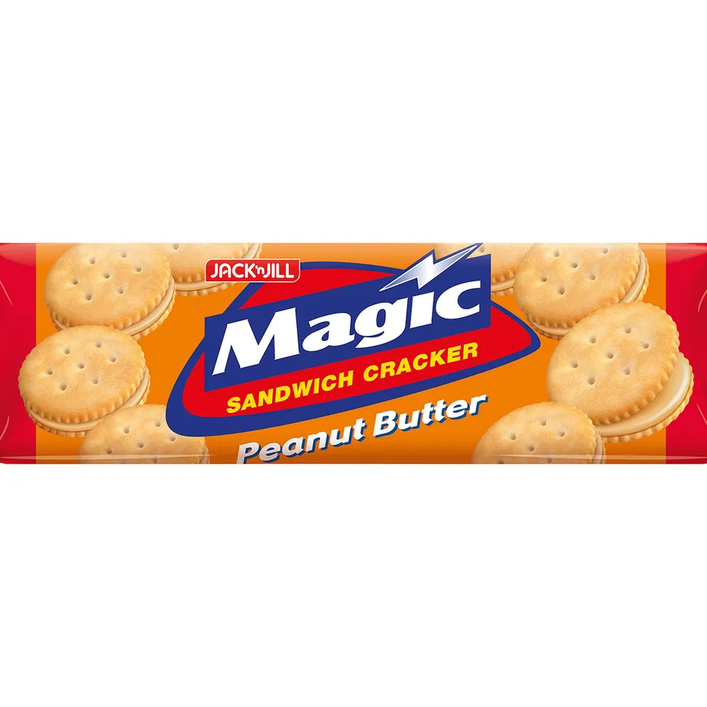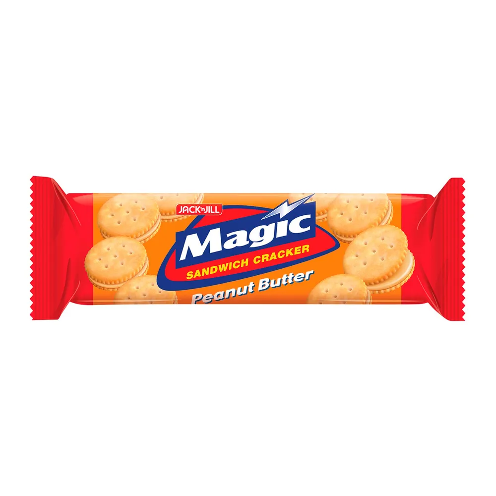 เมจิก แครกเกอร์ รสเนยถั่ว แครกเกอร์แซนวิชสอดไส้ครีมเนยถั่วที่ผ่านการคลุกเคล้าส่วนผสมที่ลงตัวของเนยสดและถั่วคัดคุณภาพพิเศษ จนกลายเป็นครีมเนยถั่วที่หอม หวาน มัน เข้ากันได้ดีกับแครกเกอร์แผ่นเรียบที่กรุบกรอบเคี้ยวเพลินได้คุณค่าและความอร่อยอย่างลงตัว<br />