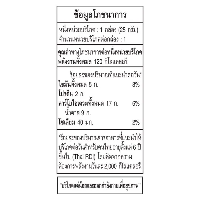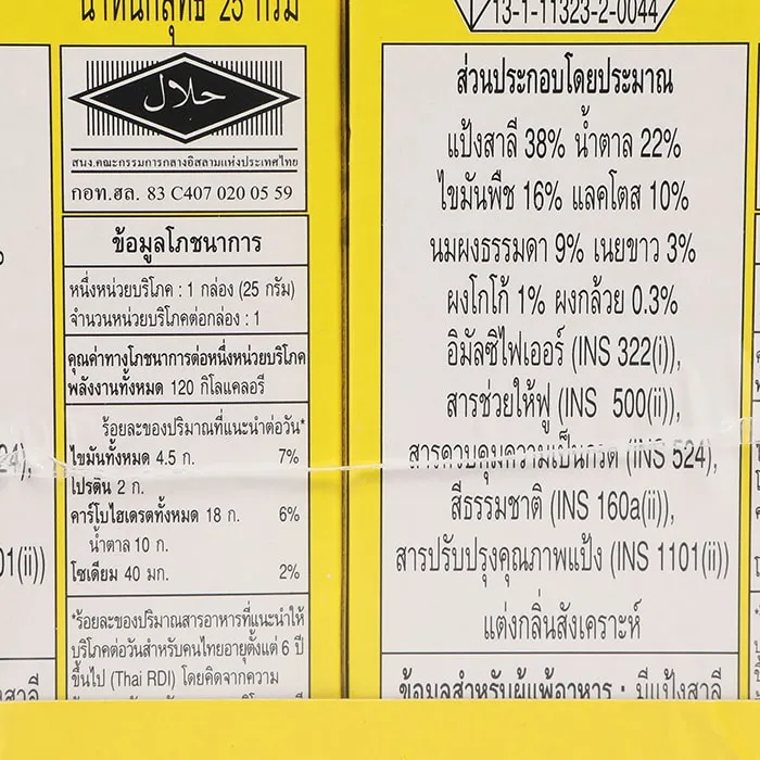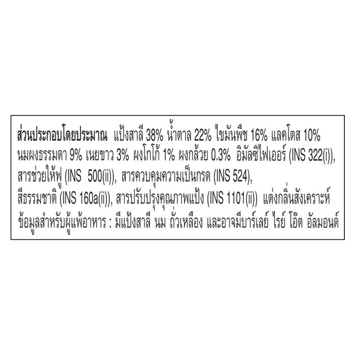 - ข้อมูลสำหรับผู้แพ้อาหาร มีแป้งสาลี นม ถั่วเหลือง และอาจมีข้าวบาร์เลย์ ข้าวไรย์ ข้าวโอ๊ต อัลมอนด์<br />