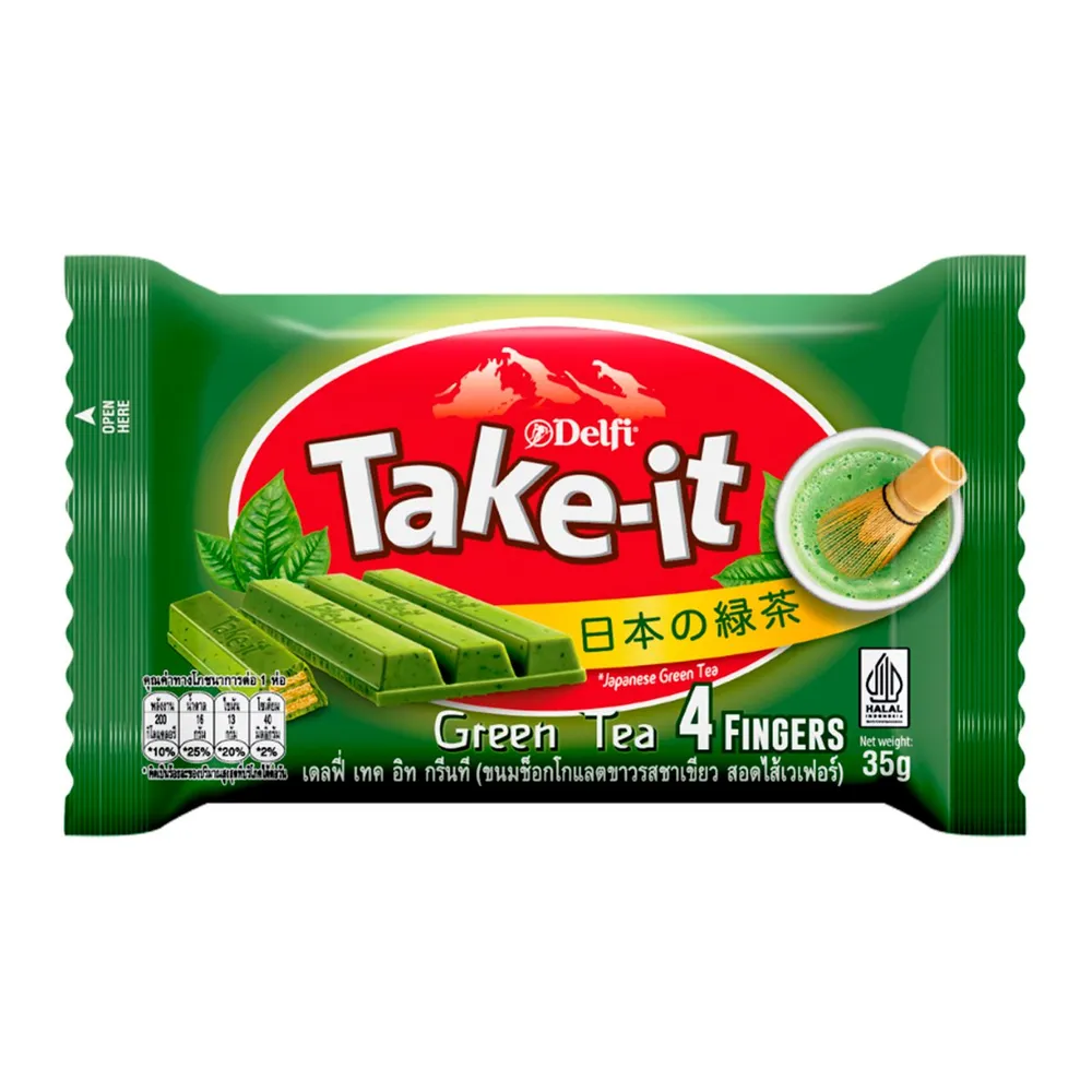 - เดลฟี่ เทค อิท กรีนที ขนมช็อกโกแลตขาวรสชาเขียว สอดไส้เวเฟอร์<br />