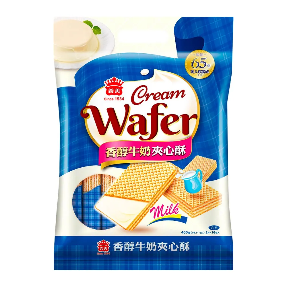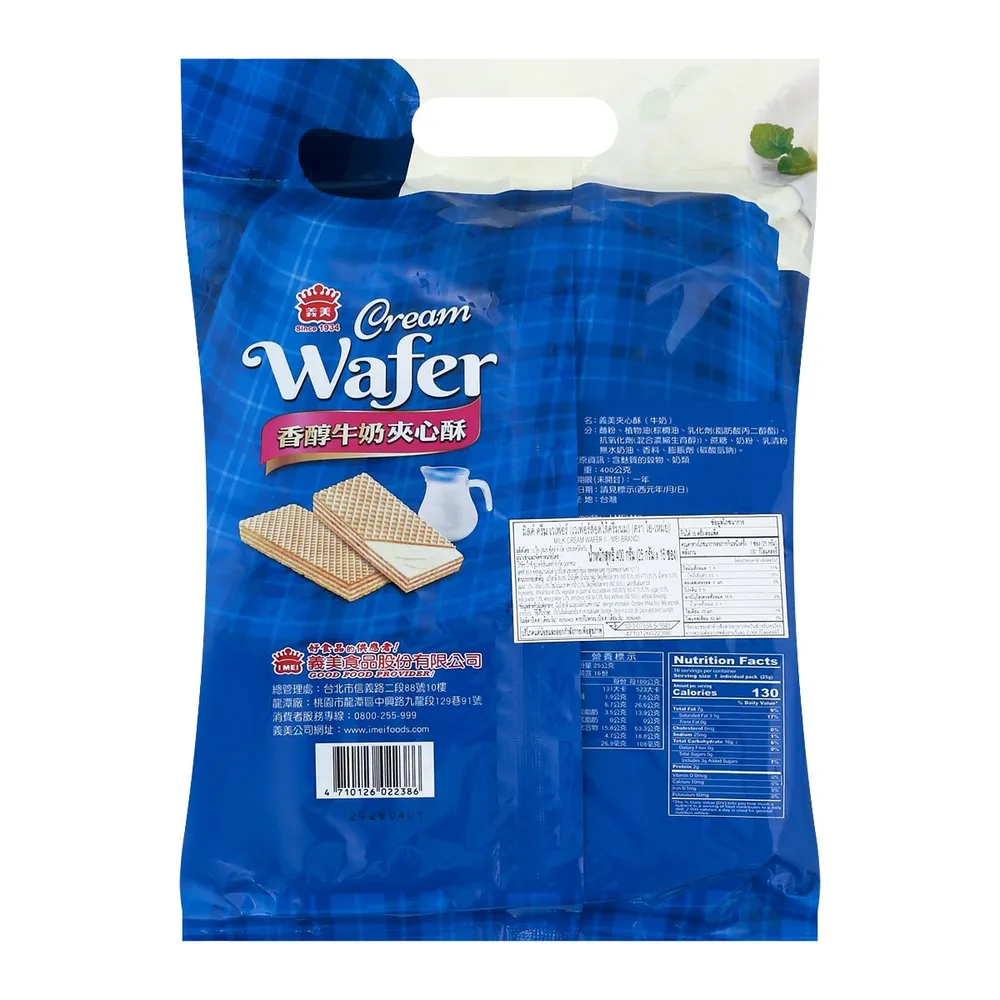 ไอ-เหม่ย มิลค์ ครีม เวเฟอร์ เป็นเวเฟอร์กรอบสอดไส้ครีมนมที่ผลิตในไต้หวัน เวเฟอร์กรอบบาง เนื้อเวเฟอร์บางเบา ให้สัมผัสกรอบนอกนุ่มใน ไส้ครีมนมเข้มข้น ไส้ครีมนมเนื้อเนียน หอมหวาน<br />