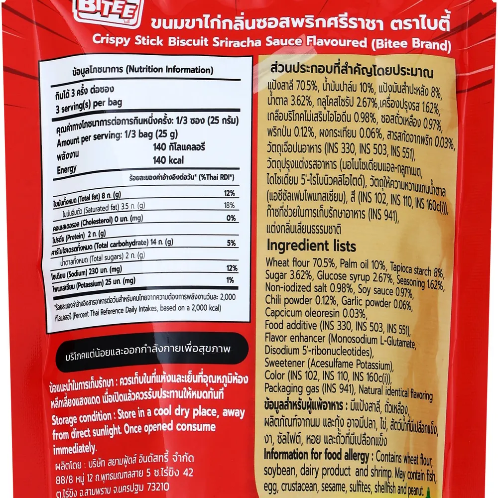 อร่อยจัดจ้านกับ ไบตี้ ขนมขาไก่รสซอสพริกศรีราชา ขนมขบเคี้ยวกรุบกรอบ ที่มาพร้อมความเปรี้ยวเผ็ดสไตล์ซอสศรีราชา หอมเครื่องเทศ รสชาติเข้มข้นกำลังดี กินเพลินได้ทุกเวลา<br />
