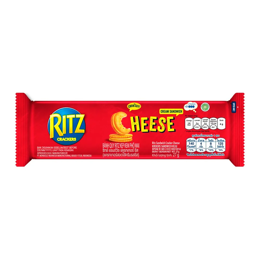 ริทซ์ แครกเกอร์ สอดไส้ครีมรสชีส แสนอร่อย ความกรุบกรอบหอมมัน ที่เข้ากันได้ดีกับไส้ครีมรสชีส ผลิตจากวัตถุดิบคุณภาพดี ผ่านกระบวนการผลิตที่ได้มาตรฐานทุกขั้นตอน สะอาด ปลอดภัย<br />