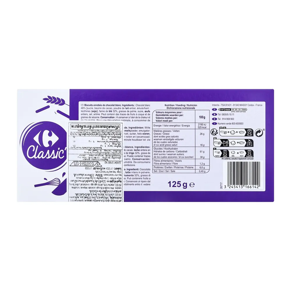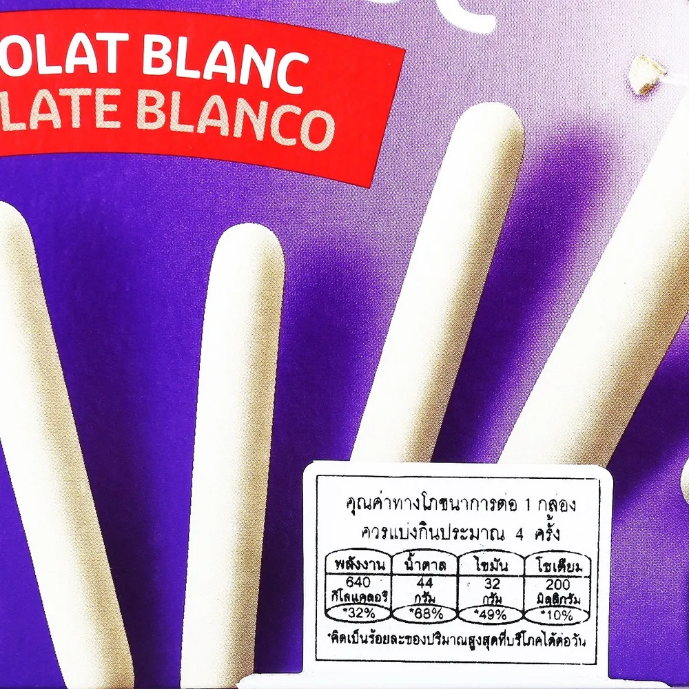 คาร์ฟูร์ สติ๊ก แอนด์ ช็อก ช็อกโกลาต์ บลอง บิสกิตแท่งอบกรอบเคลือบช็อกโกแลตขาว รสชาติหวานละมุนจากช็อกโกแลตขาวและความกรอบจากบิสกิต เหมาะสำหรับทานเป็นของว่างหรือขนมหวานที่อร่อยทุกเวลา!<br />
