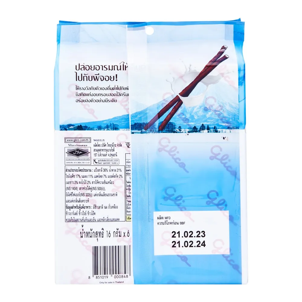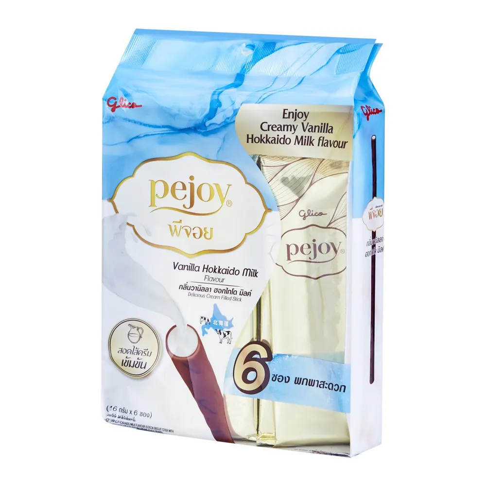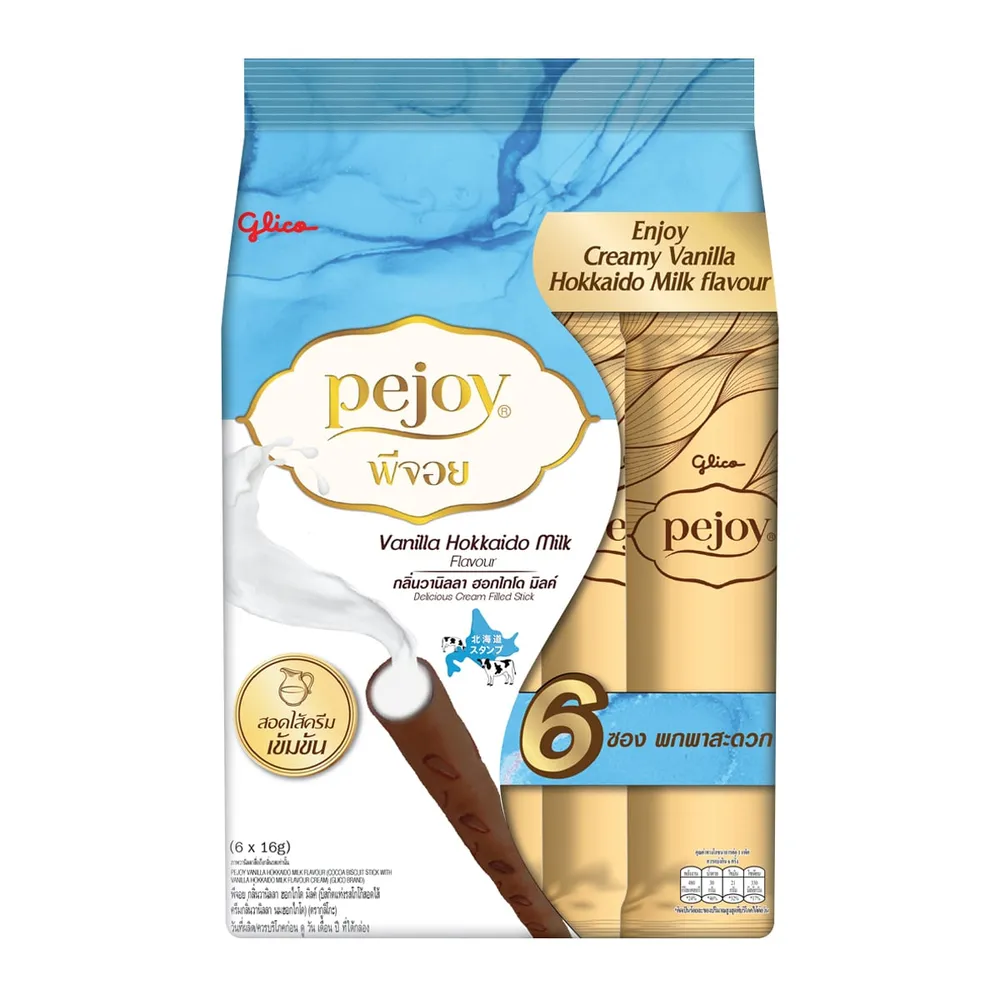 กูลิโกะ พีจอย บิสกิตแท่งรสโกโก้สอดไส้ครีมกลิ่นวานิลลา นมฮอกไกโด 16 ก. แพ็ค 6