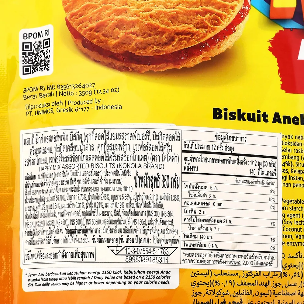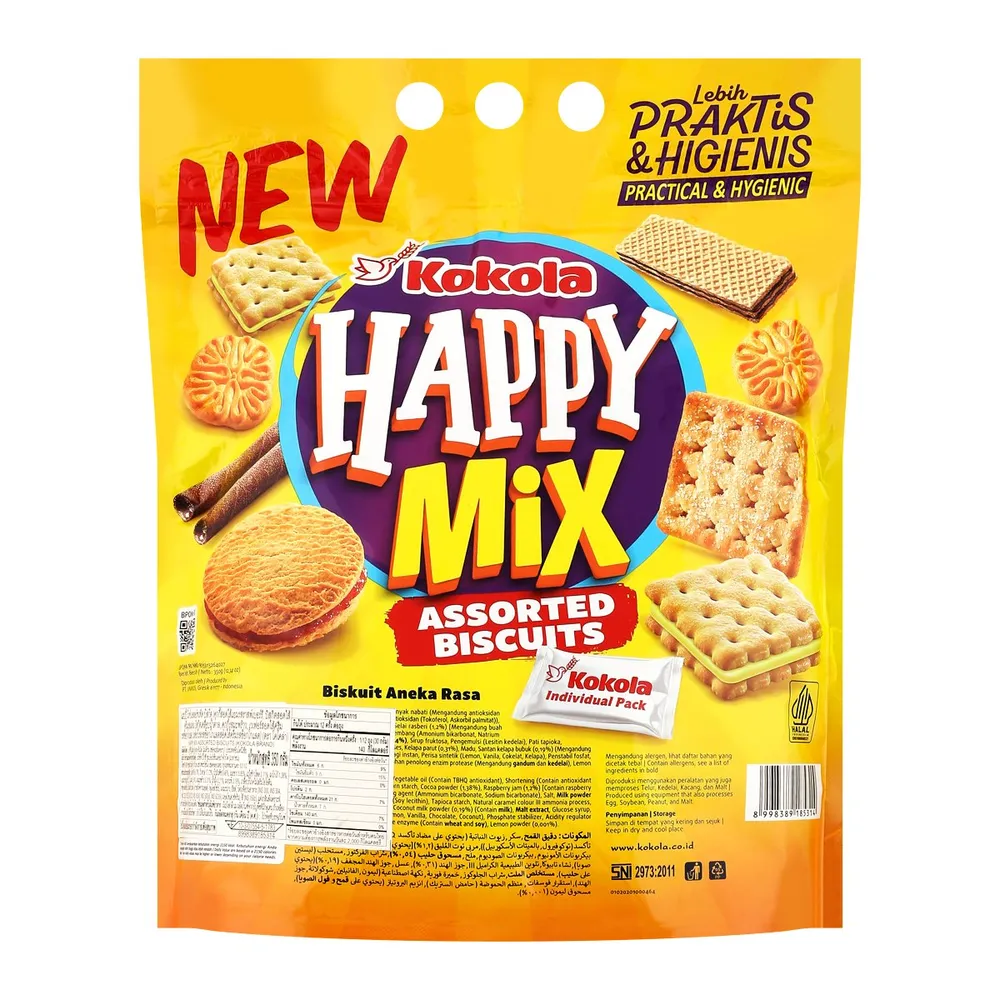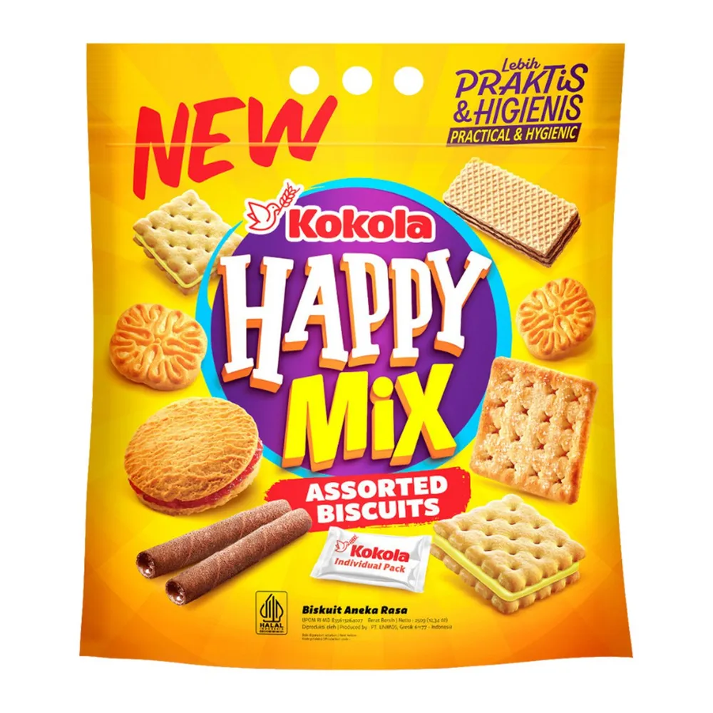 Happy Mix Assorted Biscuits จาก Kokola บิสกิตรวมรสหลากหลายรูปแบบ จาก Kokola คัดสรรความอร่อยหลากหลาย ทั้งกรอบนอกนุ่มใน หวานมันลงตัวในซองเดียว<br />