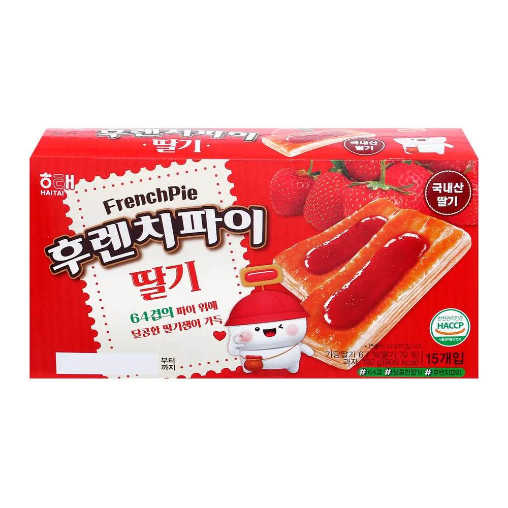 ไฮไท เฟรนช์ พาย สตรอเบอร์รี่ ชิ้นพายแผ่นบางกรอบ 64 ชั้น ขนาดหนา 2.5 มล. รูปทรงอันเป็นเอกลักษณ์ ตรงกลางสอดแยมสตรอเบอร์รี่ เนื้อเนียนละเอียดหอมอร่อยส่งตรงจากฝรั่งเศส หอมอร่อย นำเข้าจากประเทศเกาหลี ราคาไม่แพง แครกเกอร์กรอบรสชาติดั้งเดิม ตำหรับเกาหลี ผลิตจากประเทศเกาหลี ผ่านกระบวนการผลิตอย่างพิถีพิถัน ทำให้ได้แครกเกอร์ที่ หอม กรอบ อร่อย สดใหม่ทุกชิ้น<br />