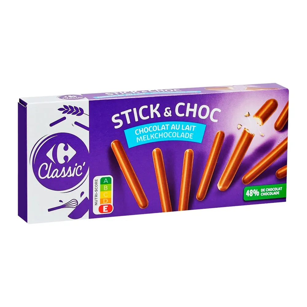 คาร์ฟูร์ สติ๊ก แอนด์ ช็อก ช็อกโกลาต์ อู เลต์ บิสกิตชนิดแท่งอบกรอบเคลือบช็อกโกแลตนม รสชาติหวานละมุนจากช็อกโกแลตนมและความกรอบจากบิสกิต เหมาะสำหรับทานเป็นของว่างหรือขนมหวานที่อร่อยทุกเวลา!<br />