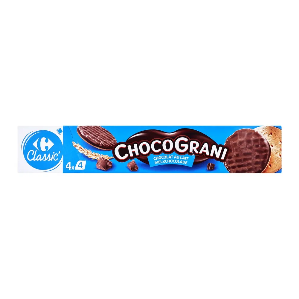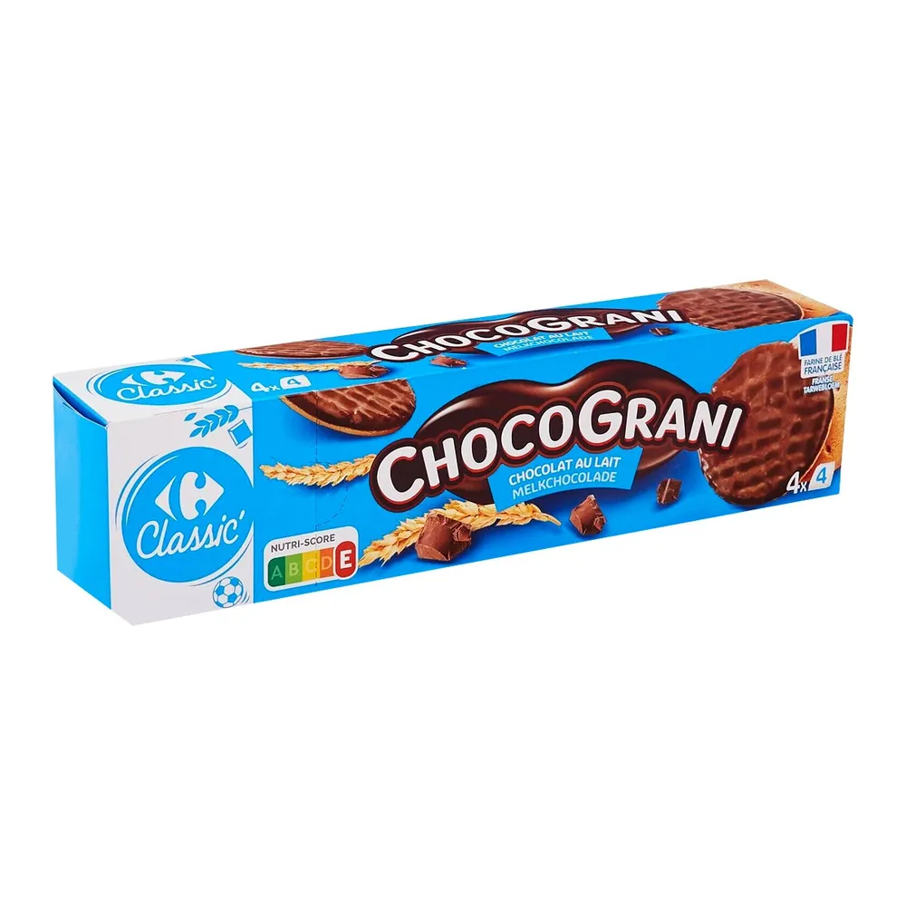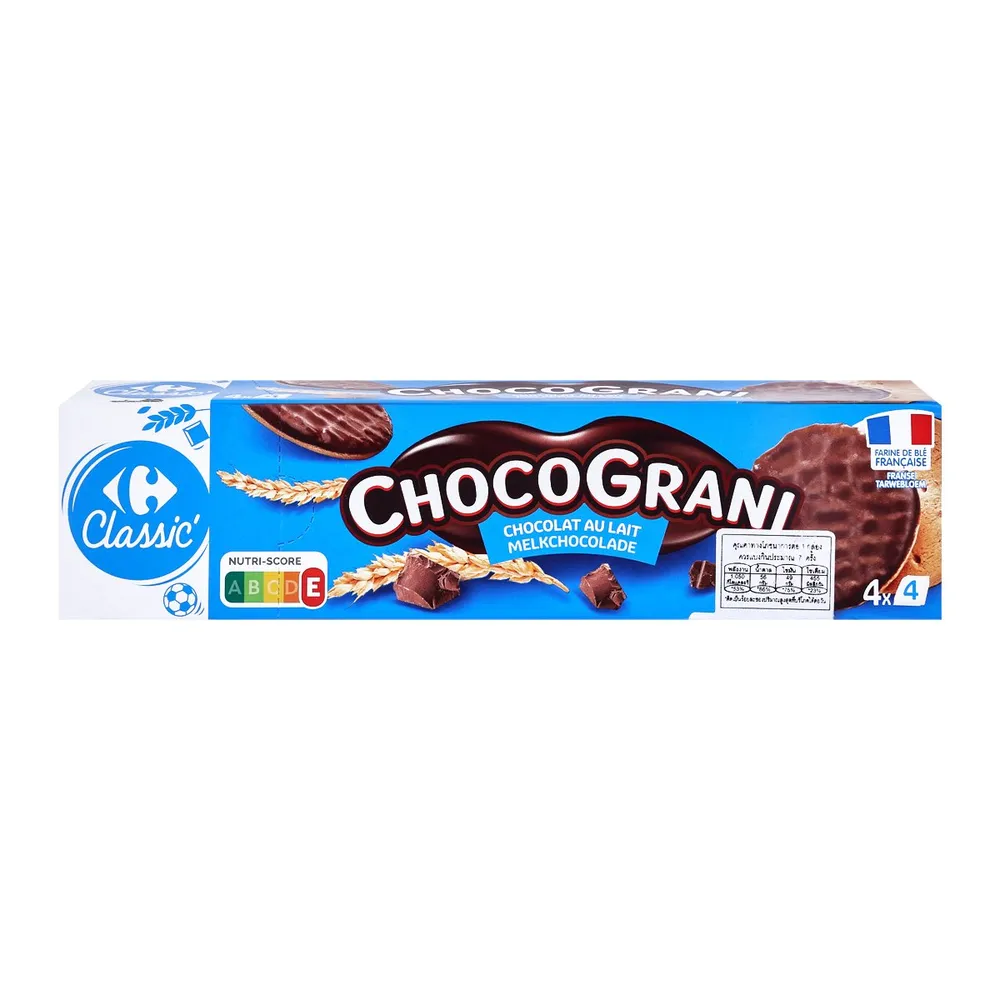 คาร์ฟูร์ ช็อกโกกรานี ช็อกโกลาต์ อู เลต์ บิสกิตกรอบราดด้วยช็อกโกแลตนม รสชาติหวานละมุน หอมช็อกโกแลต เหมาะสำหรับทานเป็นของว่างหรือขนมหวานในทุกช่วงเวลา!<br />