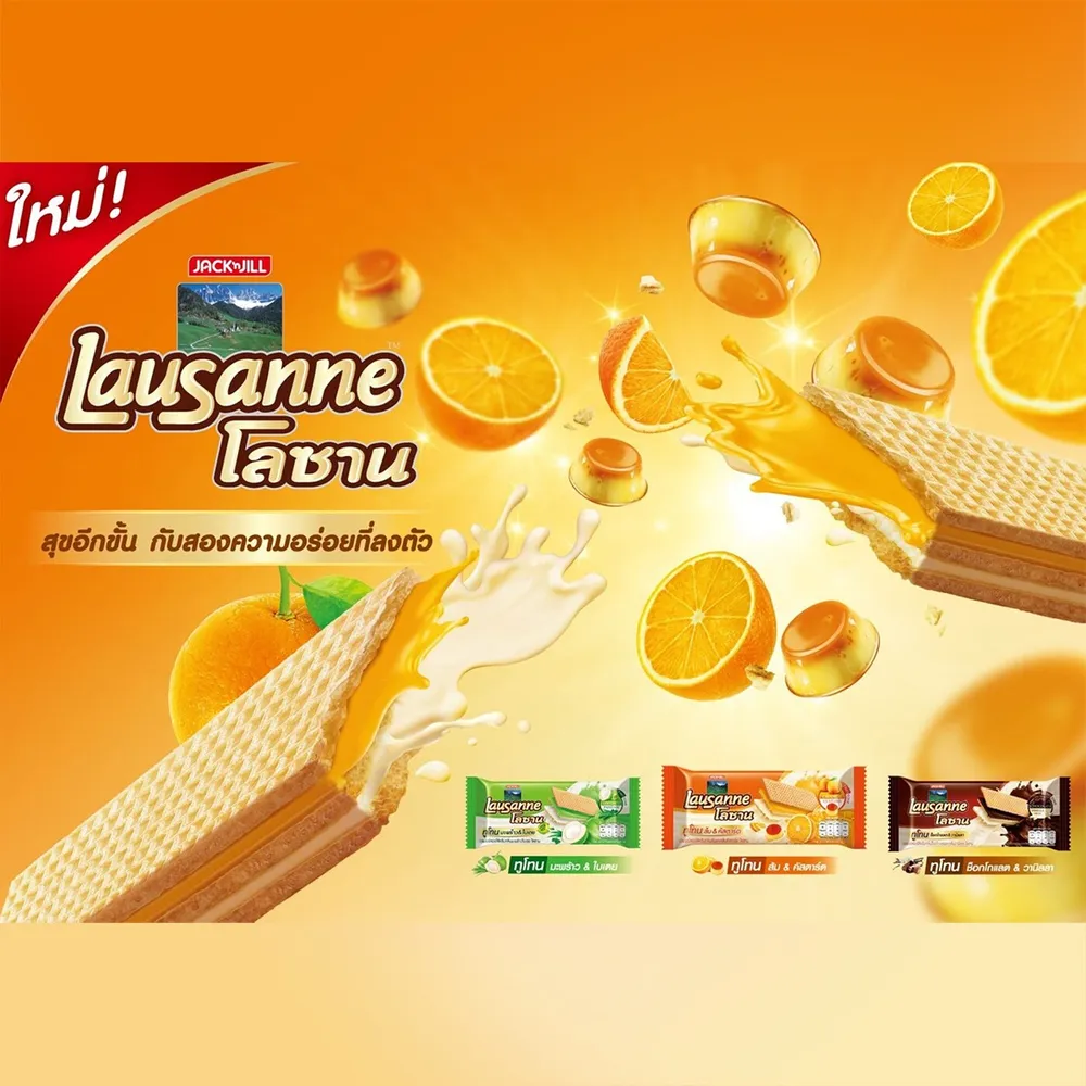 โลซาน ทูโทน เวเฟอร์สอดไส้ครีมส้มและคัสตาร์ด ให้คุณอิ่มอร่อยได้ทุกที่ ทุกเวลา ผ่านกระบวนการผลิตที่ได้มาตรฐาน เนื้อเวเฟอร์กรอบ สอดไส้ด้วยครีมส้มและคัสตาร์ดเข้มข้น อร่อยเต็มๆ คำ<br />