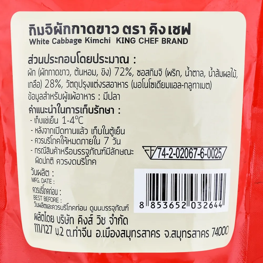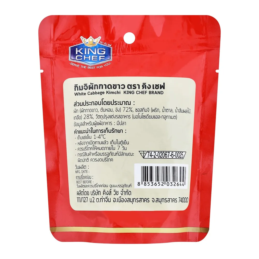 เอร็ดอร่อยไปกับ คิงเชฟ กิมจิผักกาดขาว ผลิตภัณฑ์กิมจิคุณภาพจากแบรนด์ คิงเชฟ ที่ผลิตจากวัตถุดิบคุณภาพดี ผ่านกรรมวิธีการผลิตที่ได้มาตรฐาน รสชาติอร่อย สำหรับรับประทานเป็นเครื่องเคียงอาหารเกาหลี<br />