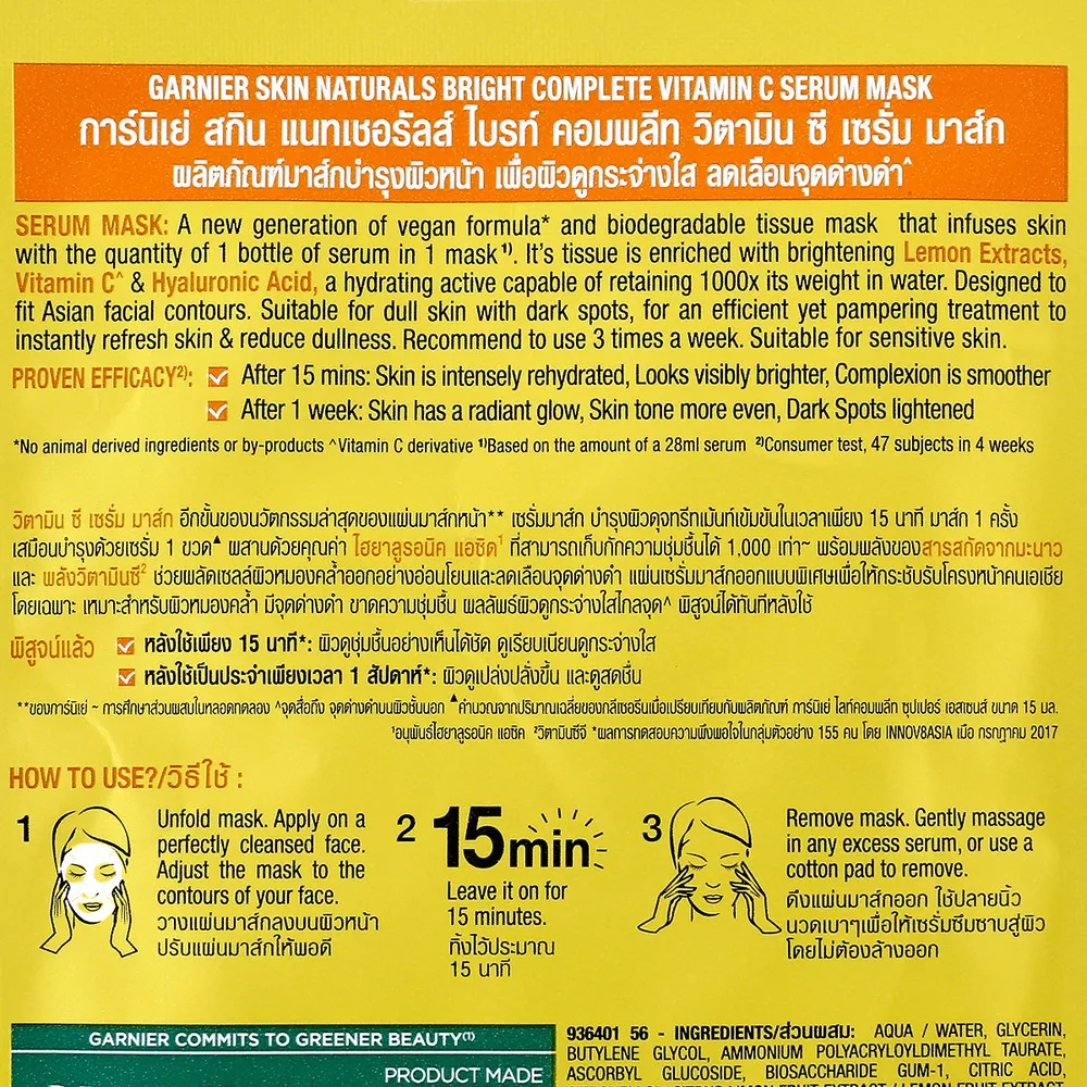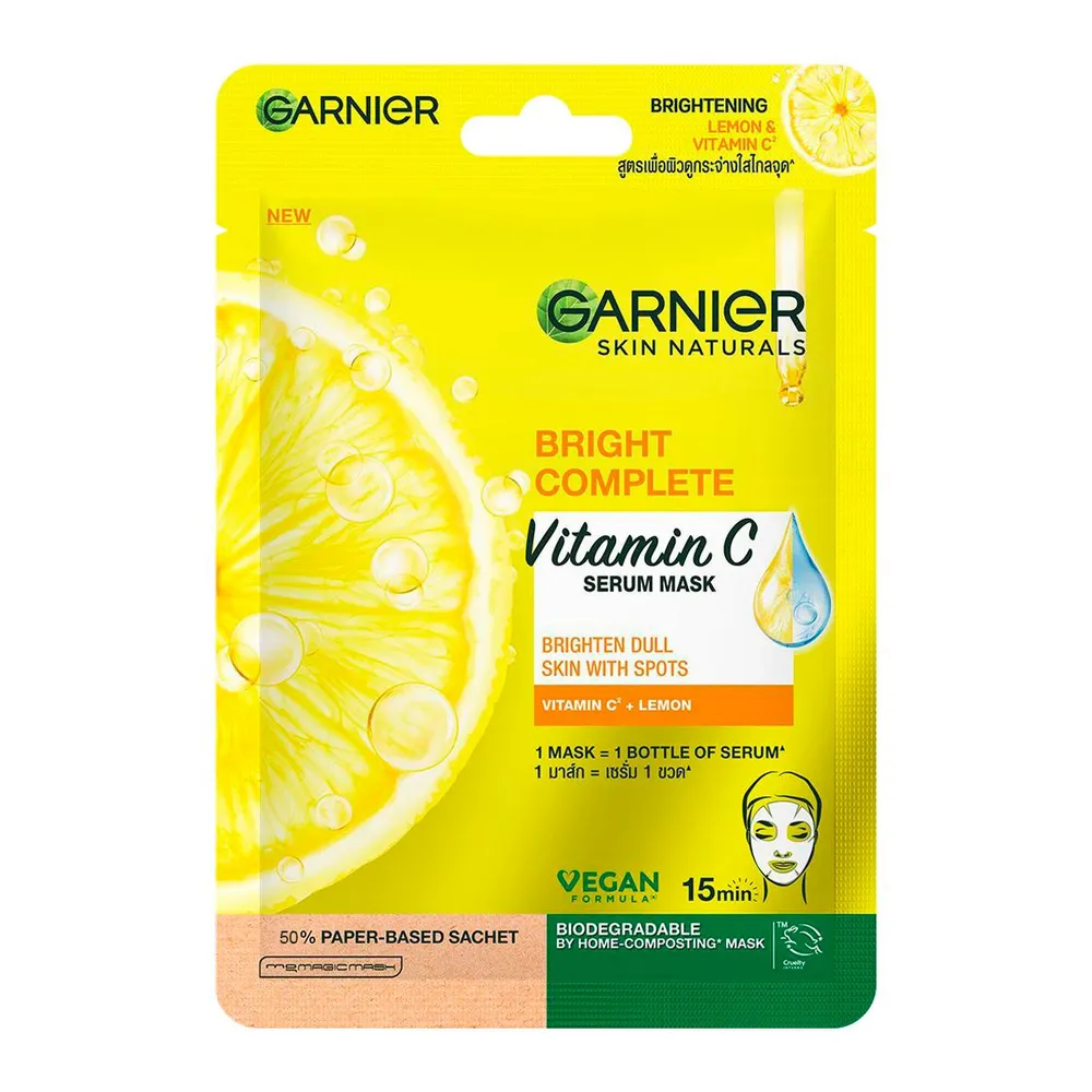 <p>การ์นิเย่ สกิน แนทเชอรัลส์ ไบรท์ คอมพลีท วิตามินซี เซรั่ม มาส์ก<br /><br />นวัตกรรมใหม่ล่าสุดจากการ์นิเย่ ไบรท์ คอมพลีท ผลิตภัณฑ์มาส์กที่ช่วยบำรุงผิวดั่งใช้เซรั่มเข้มข้นในเวลาเพียง 15 นาที ผสานสารสกัดจากมะนาวและวิตามินซี ช่วยผลัดเซลล์ผิวหมองคล้ำ และจุดด่างดำอย่างอ่อนโยน เผยความกระจ่างใสมีชีวิตชีวามากยิ่งขึ้น<br /><br />- การ์นิเย่ สกิน แนทเชอรัลส์ ไบรท์ คอมพลีท วิตามินซี เซรั่ม มาส์ก<br />- เซรั่มมาส์กสูตรเพื่อผิวกระจ่างใส ไกลจุด<br />- ผสานสารสกัดจากมะนาวและวิตามินซี ช่วยผลัดเซลล์ผิวหมองคล้ำ และจุดด่างดำอย่างอ่อนโยน<br />- ประสิทธิภาพเสมือนการใช้เซรั่มเข้มข้น 1 ขวด<br />- แผ่นมาส์กโปร่งแสง ออกแบบมากระชับรับโครงหน้า<br />- เหมาะสำหรับผิวหมองคล้ำ มีจุดด่างดไ<br /><br />