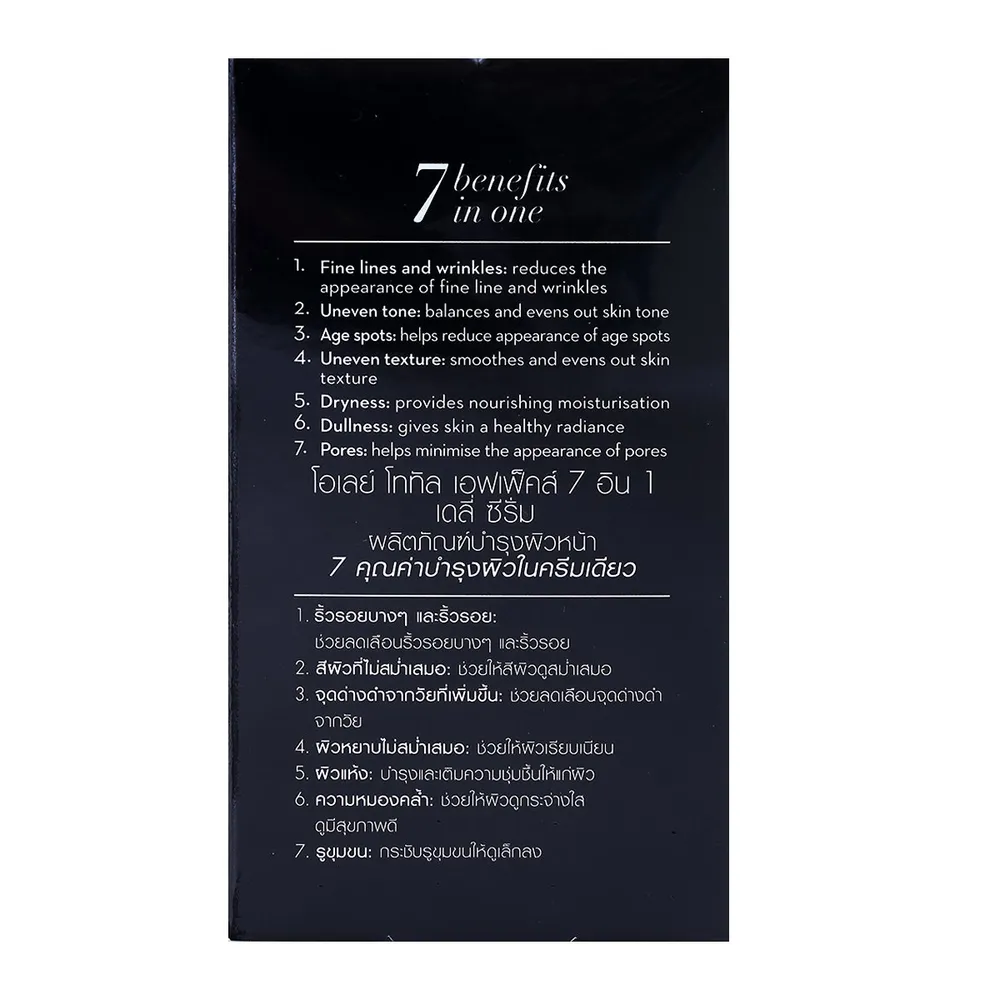 โอเลย์ โททัล เอฟเฟ็คส์ 7อิน1 เดลี่ เซรั่ม ช่วยป้องกัน 7 ปัญหาผิว ผสานสูตรเข้มข้นจากคุณค่าของ VitaNiacin และ Vitamin Complexให้ผิวคงความอ่อนเยาว์เปล่งประกาย กระจ่างใสอย่างเป็นธรรมชาติ ไม่ว่าจะทำกิจกรรมไหนๆ ก็มั่นใจอยู่ตลอดเวลา<br />