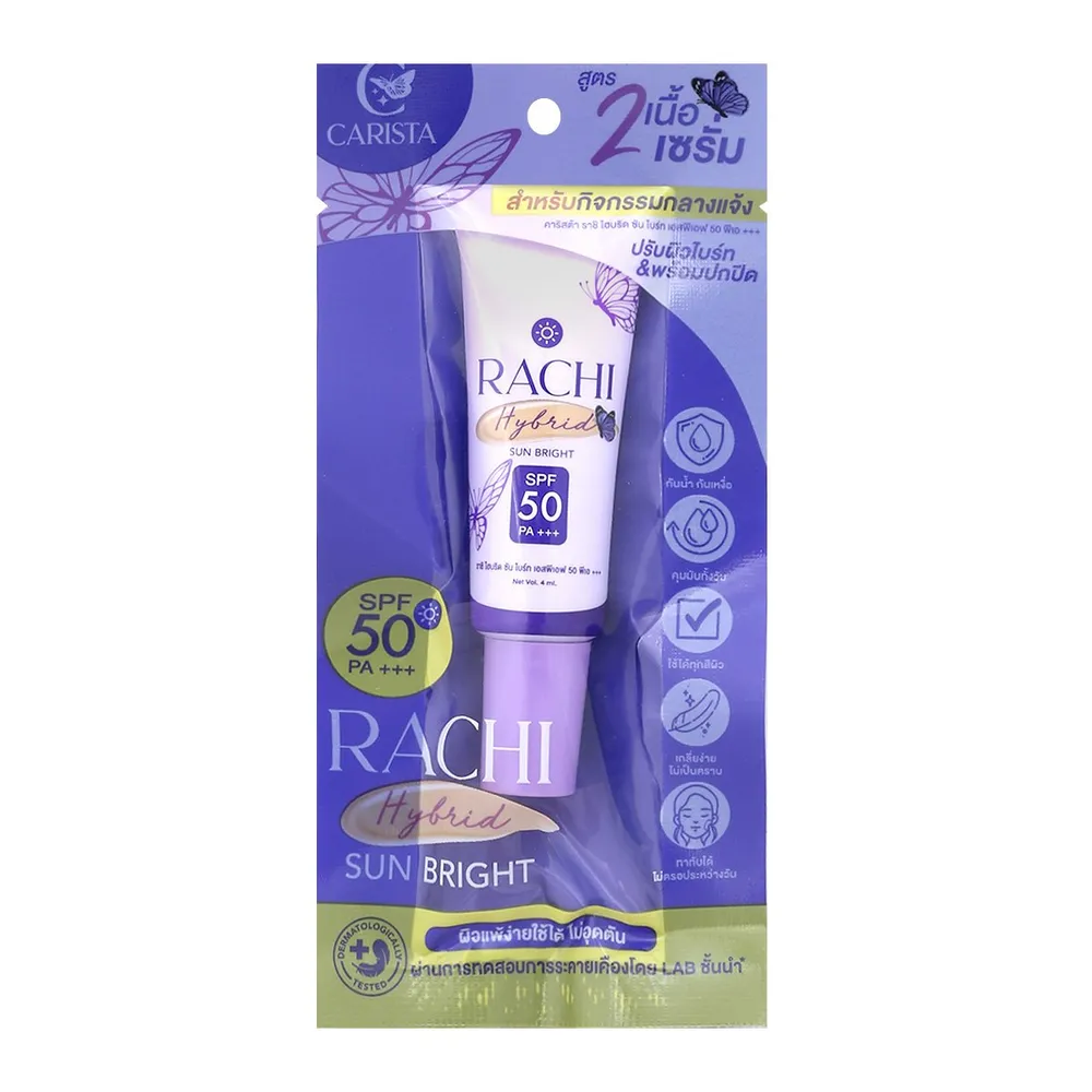 คาริสต้า ราชิ ไฮบริด ซัน ไบร์ท เอสพีเอฟ 50 พีเอ +++ เป็นกันแดดเนื้อเซรั่ม ช่วยปรับผิวไบร์ท พร้อมการปกปิดคุมมัน กันน้ำ กันเหงื่อ เกลี่ยง่ายไม่เป็นคราบ<br />