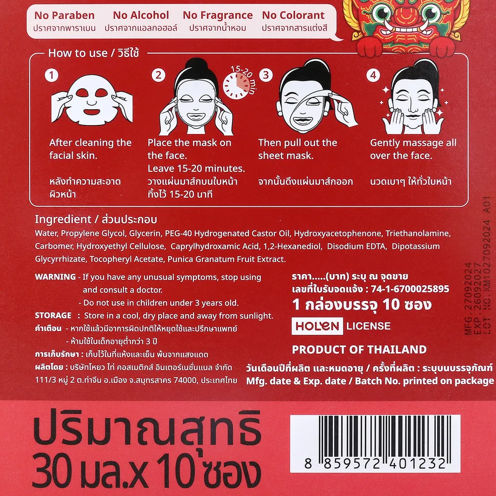 - แผ่นมาส์กจากเส้นใยไฟเบอร์ให้สัมผัสนุ่มสบาย แนบสนิทไปกับผิวหน้าได้ดี<br />