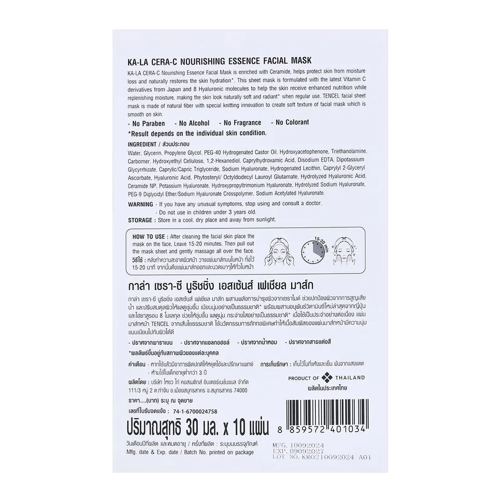 &quot;กาล่า เซรา-ซี นูริชชิ่ง เอสเซ้นส์ เฟเชียล มาส์ก&quot; ผสานการบำรุงผิวจากเซราไมด์ ช่วยปกป้องผิวจากการสูญเสียน้ำ และปรับสมดุลผิวให้แลดูชุ่มชื้น เนียนนุ่มอย่างเป็นธรรมชาติ* พร้อมผสานอนุพันธ์ของวิตามินซีใหม่ล่าสุดจากญี่ปุ่นและไฮยาลูรอน 8 โมเลกุล<br />