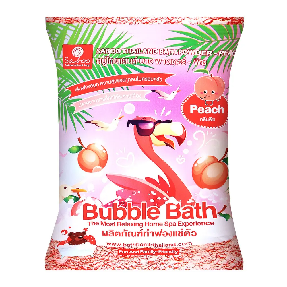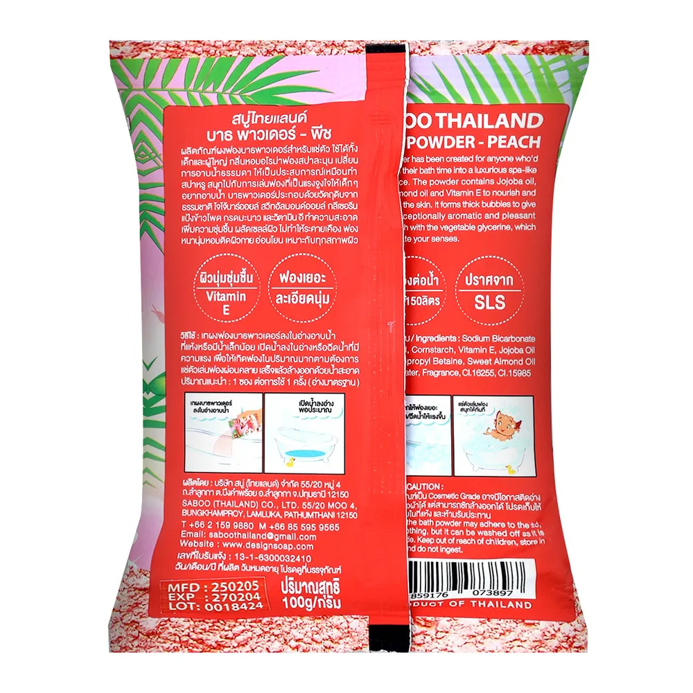 <p>สบู่ไทยแลนด์ บาธ พาวเดอร์ กลิ่นพีช<br /><br />กลิ่นหอมอโรม่าฟองสปาละมุน เปลี่ยนการอาบน้ำธรรมดา ให้เป็นประสบการณ์เหมือนทำสปาหรู สนุกไปกับการเล่นฟองที่เป็นแรงจูงใจให้เด็ก ๆ อยากอาบน้ำ<br /><br />- ส่วนผสมจากธรรมชาติ กลิ่นหอมอโรม่า<br />- วิตามินอี ต้านอนุมูลอิสระและช่วยปกป้องผิวจากรังสี UV<br />- น้ำมันโจโจ้บาร์ เพิ่มความชุ่มชื้น ลดสิวเสี้ยน และปรับสมดุลผิว<br />- น้ำมันสวีทอัลมอนด์ บรรเทาผิวแห้งและการอักเสบ พร้อมฟื้นฟูผิวที่แห้งกร้าน<br />- กลีเซอรีน แป้งข้าวโพด กรดมะนาว ทำความสะอาดและช่วยให้ผิวกระจ่างใสอย่างเป็นธรรมชาติ<br />- ปราศจาก SLS ไม่มีสารเคมีที่ทำให้ระคายเคือง<br />- เป็นมิตรกับสิ่งแวดล้อม ใช้สีที่ปลอดภัยในระดับเครื่องสำอาง<br />- ได้รับการรับรอง โรงงานสีเขียว มาตรฐาน Halal, ASEAN Cosmetic Good Manufacturing Practice (GMP22716) และ ISO9100<br /><br />วิธีใช้:<br />1. เทผงฟองบาธพาวเดอร์ลงในอ่างอาบน้ำ ที่แห้งหรือมีน้ำเล็กน้อย<br />2. เปิดน้ำลงในอ่างหรือฉีดน้ำที่มีความแรง เพื่อให้เกิดฟองในปริมาณมากตามต้องการ<br />3. แช่ตัวเล่นฟองผ่อนคลาย เสร็จแล้วล้างออกด้วยน้ำสะอาด<br /><br />ปริมาณแนะนำ: 1 ซอง/การใช้ 1 ครั้ง (อ่างมาตรฐาน)<br /><br /><span style="color: #ff0000;">สินค้าที่ได้รับอาจมีการปรับเปลี่ยนแพ็คเกจและปริมาณจากผู้ผลิต ขออนุญาตสงวนสิทธิ์ในการเปลี่ยนแปลงดังกล่าว โดยไม่แจ้งให้ทราบล่วงหน้า</span><br /><br />*สีของสินค้าอาจมีความแตกต่าง ขึ้นอยู่กับการตั้งค่าของแต่ละหน้าจอ และภาพประกอบใช้เพื่อการโฆษณาเท่านั้น</p>